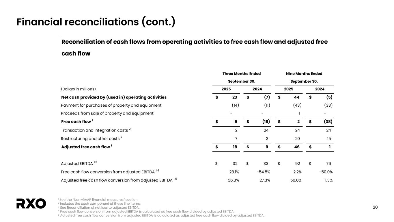 19 Financial reconciliations (cont.) 1 The tax impact of non-GAAP adjustments represents the tax expense calculated using the applicable statutory tax rate that would have been incurred had these adjustments been excluded from net loss. Our estimated tax rate on non-GAAP adjustments may differ from our GAAP tax rate due to differences in the methodologies applied. 2 See the "Non-GAAP financial measures" section. (Dollars in millions, shares in thousands, expect per share amounts) 2025 2024 2025 2024 Net loss (14)$ (243)$ (54)$ (265)$ Amortization of intangible assets 10 5 36 11 Transaction and integration costs 5 30 18 38 Restructuring and other costs 7 218 24 233 Income tax associated with the adjustments above 1 (6) (3) (20) (10) Adjusted net income 2 2$ 7$ 4$ 7$ Adjusted diluted income per share 2 0.01$ 0.05$ 0.02$ 0.06$ Weighted-average common shares outstanding Diluted 169,265 136,968 169,185 125,536 Reconciliation of net loss to adjusted net income and adjusted diluted income per share Three Months Ended September 30, Nine Months Ended September 30,