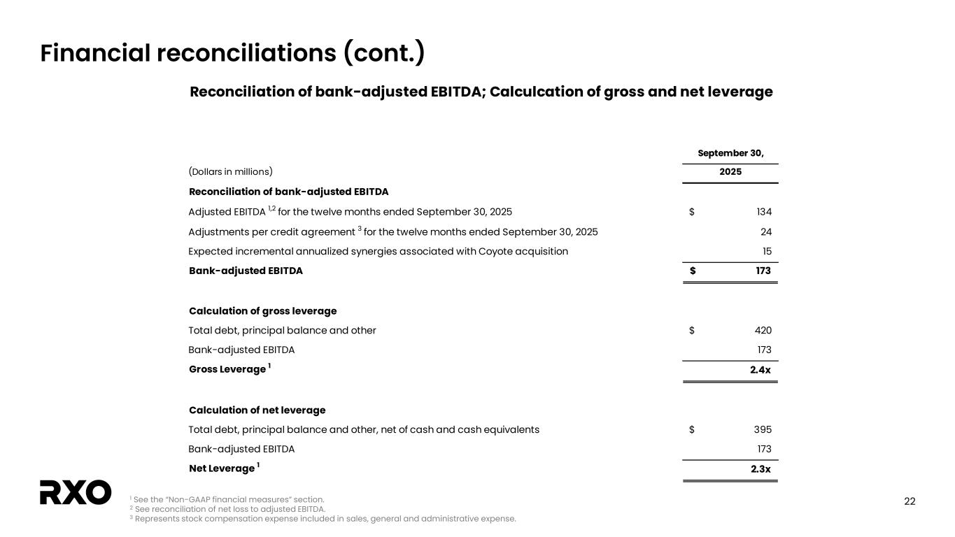 21 Financial reconciliations (cont.) 1 Complementary services include Last Mile and Managed Transportation services. Calculation of gross margin and gross margin as a percentage of revenue (Dollars in millions) 2025 2024 2025 2024 Revenue Truck brokerage 1,039$ 655$ 3,131$ 1,762$ Complementary services 1 442 419 1,314 1,224 Eliminations (60) (34) (172) (103) Revenue 1,421$ 1,040$ 4,273$ 2,883$ Cost of transportation and services (exclusive of depreciation and amortization) Truck brokerage 899$ 564$ 2,700$ 1,510$ Complementary services 1 298 279 880 801 Eliminations (60) (34) (172) (103) Cost of transportation and services (exclusive of depreciation and amortization) 1,137$ 809$ 3,408$ 2,208$ Direct operating expense (exclusive of depreciation and amortization) Truck brokerage -$ 1$ 1$ 1$ Complementary services 1 48 48 142$ 151$ Direct operating expense (exclusive of depreciation and amortization) 48$ 49$ 143$ 152$ Direct depreciation and amortization Truck brokerage -$ -$ -$ 1$ Complementary services 1 2 2 7$ 6$ Direct depreciation and amortization 2$ 2$ 7$ 7$ Gross margin Truck brokerage 140$ 90$ 430$ 250$ Complementary services 1 94 90 285$ 266$ Gross margin 234$ 180$ 715$ 516$ Gross margin as a percentage of revenue Truck brokerage 13.5% 13.7% 13.7% 14.2% Complementary services 1 21.3% 21.5% 21.7% 21.7% Gross margin as a percentage of revenue 16.5% 17.3% 16.7% 17.9% Three Months Ended September 30, Nine Months Ended September 30,