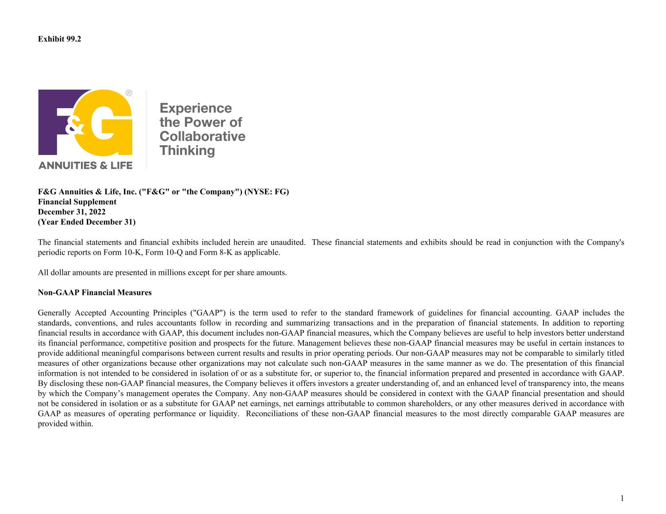 Exhibit 99.2 F&G Annuities & Life, Inc. ("F&G" or "the Company") (NYSE: FG) Financial Supplement December 31, 2022 (Year Ended December 31) The financial statements and financial exhibits included herein are unaudited. These financial statements and exhibits should be read in conjunction with the Company's periodic reports on Form 10-K, Form 10-Q and Form 8-K as applicable. All dollar amounts are presented in millions except for per share amounts. Non-GAAP Financial Measures Generally Accepted Accounting Principles ("GAAP") is the term used to refer to the standard framework of guidelines for financial accounting. GAAP includes the standards, conventions, and rules accountants follow in recording and summarizing transactions and in the preparation of financial statements. In addition to reporting financial results in accordance with GAAP, this document includes non-GAAP financial measures, which the Company believes are useful to help investors better understand its financial performance, competitive position and prospects for the future. Management believes these non-GAAP financial measures may be useful in certain instances to provide additional meaningful comparisons between current results and results in prior operating periods. Our non-GAAP measures may not be comparable to similarly titled measures of other organizations because other organizations may not calculate such non-GAAP measures in the same manner as we do. The presentation of this financial information is not intended to be considered in isolation of or as a substitute for, or superior to, the financial information prepared and presented in accordance with GAAP. By disclosing these non-GAAP financial measures, the Company believes it offers investors a greater understanding of, and an enhanced level of transparency into, the means by which the Company’s management operates the Company. Any non-GAAP measures should be considered in context with the GAAP financial presentation and should not be considered in isolation or as a substitute for GAAP net earnings, net earnings attributable to common shareholders, or any other measures derived in accordance with GAAP as measures of operating performance or liquidity. Reconciliations of these non-GAAP financial measures to the most directly comparable GAAP measures are provided within. 1