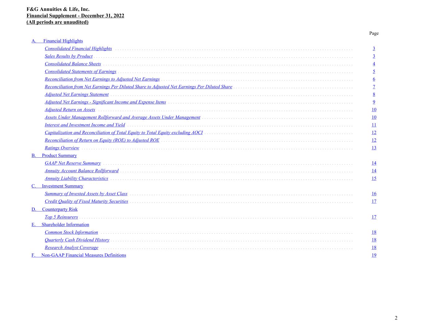 Page A. Financial Highlights Consolidated Financial Highlights . . . . . . . . . . . . . . . . . . . . . . . . . . . . . . . . . . . . . . . . . . . . . . . . . . . . . . . . . . . . . . . . . . . . . . . . . . . . . . . . . . . . . . . . . . . . . . . . . . . 3 Sales Results by Product . . . . . . . . . . . . . . . . . . . . . . . . . . . . . . . . . . . . . . . . . . . . . . . . . . . . . . . . . . . . . . . . . . . . . . . . . . . . . . . . . . . . . . . . . . . . . . . . . . . . . . . . . . . . 3 Consolidated Balance Sheets . . . . . . . . . . . . . . . . . . . . . . . . . . . . . . . . . . . . . . . . . . . . . . . . . . . . . . . . . . . . . . . . . . . . . . . . . . . . . . . . . . . . . . . . . . . . . . . . . . . . . . . . 4 Consolidated Statements of Earnings . . . . . . . . . . . . . . . . . . . . . . . . . . . . . . . . . . . . . . . . . . . . . . . . . . . . . . . . . . . . . . . . . . . . . . . . . . . . . . . . . . . . . . . . . . . . . . . . . . 5 Reconciliation from Net Earnings to Adjusted Net Earnings . . . . . . . . . . . . . . . . . . . . . . . . . . . . . . . . . . . . . . . . . . . . . . . . . . . . . . . . . . . . . . . . . . . . . . . . . . . . . . . . 6 Reconciliation from Net Earnings Per Diluted Share to Adjusted Net Earnings Per Diluted Share . . . . . . . . . . . . . . . . . . . . . . . . . . . . . . . . . . . . . . . . . . . . . . . . . . 7 Adjusted Net Earnings Statement . . . . . . . . . . . . . . . . . . . . . . . . . . . . . . . . . . . . . . . . . . . . . . . . . . . . . . . . . . . . . . . . . . . . . . . . . . . . . . . . . . . . . . . . . . . . . . . . . . . . . 8 Adjusted Net Earnings - Significant Income and Expense Items . . . . . . . . . . . . . . . . . . . . . . . . . . . . . . . . . . . . . . . . . . . . . . . . . . . . . . . . . . . . . . . . . . . . . . . . . . . . . 9 Adjusted Return on Assets . . . . . . . . . . . . . . . . . . . . . . . . . . . . . . . . . . . . . . . . . . . . . . . . . . . . . . . . . . . . . . . . . . . . . . . . . . . . . . . . . . . . . . . . . . . . . . . . . . . . . . . . . . 10 Assets Under Management Rollforward and Average Assets Under Management . . . . . . . . . . . . . . . . . . . . . . . . . . . . . . . . . . . . . . . . . . . . . . . . . . . . . . . . . . . . . . . 10 Interest and Investment Income and Yield . . . . . . . . . . . . . . . . . . . . . . . . . . . . . . . . . . . . . . . . . . . . . . . . . . . . . . . . . . . . . . . . . . . . . . . . . . . . . . . . . . . . . . . . . . . . . . 11 Capitalization and Reconciliation of Total Equity to Total Equity excluding AOCI . . . . . . . . . . . . . . . . . . . . . . . . . . . . . . . . . . . . . . . . . . . . . . . . . . . . . . . . . . . . . . 12 Reconciliation of Return on Equity (ROE) to Adjusted ROE . . . . . . . . . . . . . . . . . . . . . . . . . . . . . . . . . . . . . . . . . . . . . . . . . . . . . . . . . . . . . . . . . . . . . . . . . . . . . . . . 12 Ratings Overview . . . . . . . . . . . . . . . . . . . . . . . . . . . . . . . . . . . . . . . . . . . . . . . . . . . . . . . . . . . . . . . . . . . . . . . . . . . . . . . . . . . . . . . . . . . . . . . . . . . . . . . . . . . . . . . . . 13 B. Product Summary GAAP Net Reserve Summary . . . . . . . . . . . . . . . . . . . . . . . . . . . . . . . . . . . . . . . . . . . . . . . . . . . . . . . . . . . . . . . . . . . . . . . . . . . . . . . . . . . . . . . . . . . . . . . . . . . . . . . . 14 Annuity Account Balance Rollforward . . . . . . . . . . . . . . . . . . . . . . . . . . . . . . . . . . . . . . . . . . . . . . . . . . . . . . . . . . . . . . . . . . . . . . . . . . . . . . . . . . . . . . . . . . . . . . . . . 14 Annuity Liability Characteristics . . . . . . . . . . . . . . . . . . . . . . . . . . . . . . . . . . . . . . . . . . . . . . . . . . . . . . . . . . . . . . . . . . . . . . . . . . . . . . . . . . . . . . . . . . . . . . . . . . . . . 15 C. Investment Summary Summary of Invested Assets by Asset Class . . . . . . . . . . . . . . . . . . . . . . . . . . . . . . . . . . . . . . . . . . . . . . . . . . . . . . . . . . . . . . . . . . . . . . . . . . . . . . . . . . . . . . . . . . . . . 16 Credit Quality of Fixed Maturity Securities . . . . . . . . . . . . . . . . . . . . . . . . . . . . . . . . . . . . . . . . . . . . . . . . . . . . . . . . . . . . . . . . . . . . . . . . . . . . . . . . . . . . . . . . . . . . . 17 D. Counterparty Risk Top 5 Reinsurers . . . . . . . . . . . . . . . . . . . . . . . . . . . . . . . . . . . . . . . . . . . . . . . . . . . . . . . . . . . . . . . . . . . . . . . . . . . . . . . . . . . . . . . . . . . . . . . . . . . . . . . . . . . . . . . . . . 17 E. Shareholder Information Common Stock Information . . . . . . . . . . . . . . . . . . . . . . . . . . . . . . . . . . . . . . . . . . . . . . . . . . . . . . . . . . . . . . . . . . . . . . . . . . . . . . . . . . . . . . . . . . . . . . . . . . . . . . . . . 18 Quarterly Cash Dividend History . . . . . . . . . . . . . . . . . . . . . . . . . . . . . . . . . . . . . . . . . . . . . . . . . . . . . . . . . . . . . . . . . . . . . . . . . . . . . . . . . . . . . . . . . . . . . . . . . . . . . 18 Research Analyst Coverage . . . . . . . . . . . . . . . . . . . . . . . . . . . . . . . . . . . . . . . . . . . . . . . . . . . . . . . . . . . . . . . . . . . . . . . . . . . . . . . . . . . . . . . . . . . . . . . . . . . . . . . . . 18 F. Non-GAAP Financial Measures Definitions 19 F&G Annuities & Life, Inc. Financial Supplement - December 31, 2022 (All periods are unaudited) 2