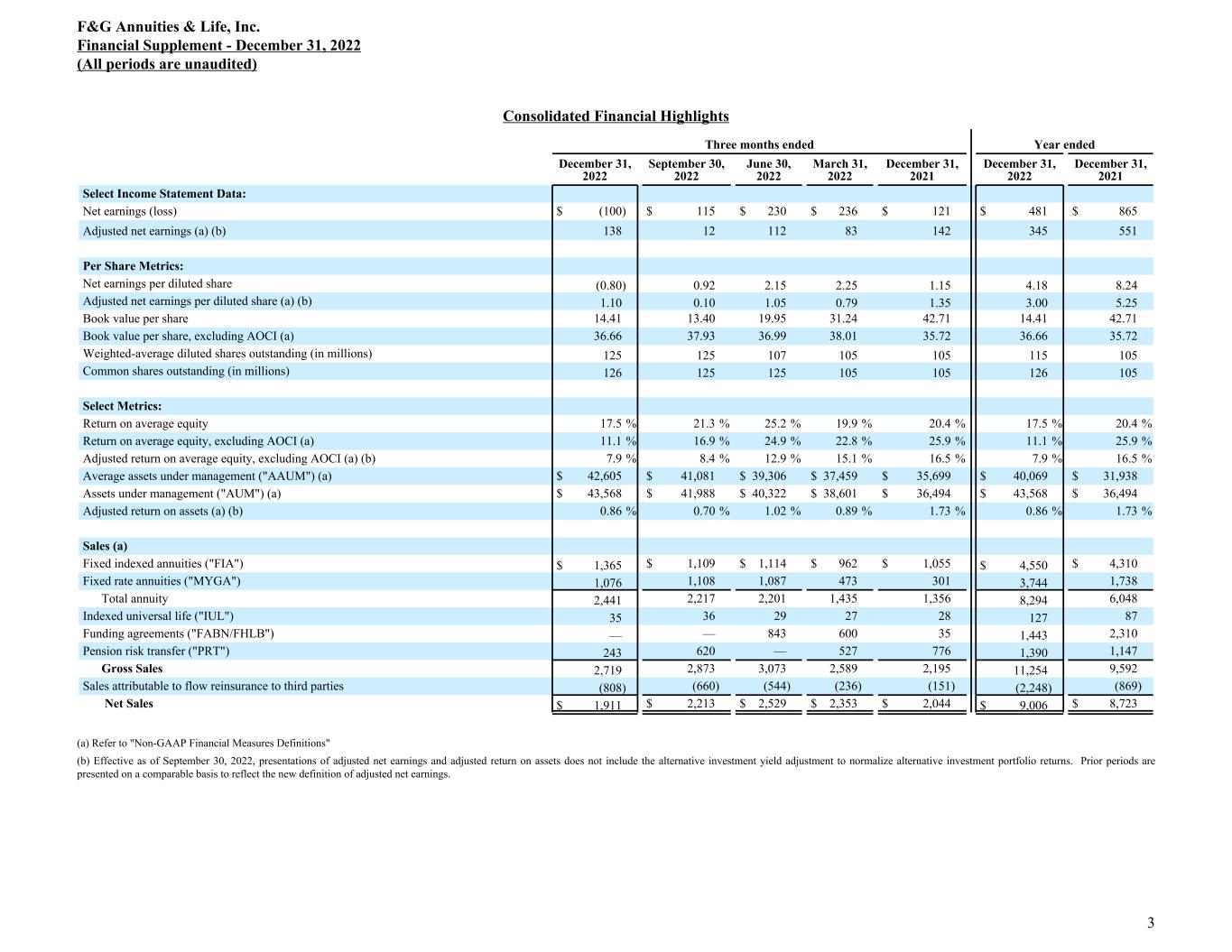 Consolidated Financial Highlights Three months ended Year ended December 31, 2022 September 30, 2022 June 30, 2022 March 31, 2022 December 31, 2021 December 31, 2022 December 31, 2021 Select Income Statement Data: Net earnings (loss) $ (100) $ 115 $ 230 $ 236 $ 121 $ 481 $ 865 Adjusted net earnings (a) (b) 138 12 112 83 142 345 551 Per Share Metrics: Net earnings per diluted share (0.80) 0.92 2.15 2.25 1.15 4.18 8.24 Adjusted net earnings per diluted share (a) (b) 1.10 0.10 1.05 0.79 1.35 3.00 5.25 Book value per share 14.41 13.40 19.95 31.24 42.71 14.41 42.71 Book value per share, excluding AOCI (a) 36.66 37.93 36.99 38.01 35.72 36.66 35.72 Weighted-average diluted shares outstanding (in millions) 125 125 107 105 105 115 105 Common shares outstanding (in millions) 126 125 125 105 105 126 105 Select Metrics: Return on average equity 17.5 % 21.3 % 25.2 % 19.9 % 20.4 % 17.5 % 20.4 % Return on average equity, excluding AOCI (a) 11.1 % 16.9 % 24.9 % 22.8 % 25.9 % 11.1 % 25.9 % Adjusted return on average equity, excluding AOCI (a) (b) 7.9 % 8.4 % 12.9 % 15.1 % 16.5 % 7.9 % 16.5 % Average assets under management ("AAUM") (a) $ 42,605 $ 41,081 $ 39,306 $ 37,459 $ 35,699 $ 40,069 $ 31,938 Assets under management ("AUM") (a) $ 43,568 $ 41,988 $ 40,322 $ 38,601 $ 36,494 $ 43,568 $ 36,494 Adjusted return on assets (a) (b) 0.86 % 0.70 % 1.02 % 0.89 % 1.73 % 0.86 % 1.73 % Sales (a) Fixed indexed annuities ("FIA") $ 1,365 $ 1,109 $ 1,114 $ 962 $ 1,055 $ 4,550 $ 4,310 Fixed rate annuities ("MYGA") 1,076 1,108 1,087 473 301 3,744 1,738 Total annuity 2,441 2,217 2,201 1,435 1,356 8,294 6,048 Indexed universal life ("IUL") 35 36 29 27 28 127 87 Funding agreements ("FABN/FHLB") — — 843 600 35 1,443 2,310 Pension risk transfer ("PRT") 243 620 — 527 776 1,390 1,147 Gross Sales 2,719 2,873 3,073 2,589 2,195 11,254 9,592 Sales attributable to flow reinsurance to third parties (808) (660) (544) (236) (151) (2,248) (869) Net Sales $ 1,911 $ 2,213 $ 2,529 $ 2,353 $ 2,044 $ 9,006 $ 8,723 (a) Refer to "Non-GAAP Financial Measures Definitions" (b) Effective as of September 30, 2022, presentations of adjusted net earnings and adjusted return on assets does not include the alternative investment yield adjustment to normalize alternative investment portfolio returns. Prior periods are presented on a comparable basis to reflect the new definition of adjusted net earnings. F&G Annuities & Life, Inc. Financial Supplement - December 31, 2022 (All periods are unaudited) 3