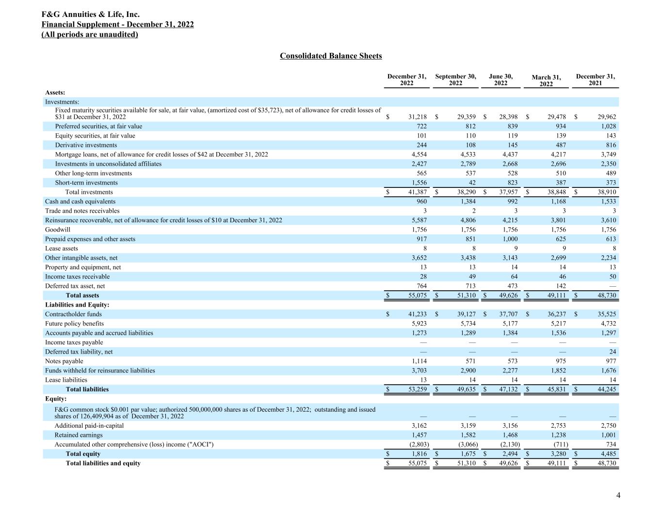 Consolidated Balance Sheets December 31, 2022 September 30, 2022 June 30, 2022 March 31, 2022 December 31, 2021 Assets: Investments: Fixed maturity securities available for sale, at fair value, (amortized cost of $35,723), net of allowance for credit losses of $31 at December 31, 2022 $ 31,218 $ 29,359 $ 28,398 $ 29,478 $ 29,962 Preferred securities, at fair value 722 812 839 934 1,028 Equity securities, at fair value 101 110 119 139 143 Derivative investments 244 108 145 487 816 Mortgage loans, net of allowance for credit losses of $42 at December 31, 2022 4,554 4,533 4,437 4,217 3,749 Investments in unconsolidated affiliates 2,427 2,789 2,668 2,696 2,350 Other long-term investments 565 537 528 510 489 Short-term investments 1,556 42 823 387 373 Total investments $ 41,387 $ 38,290 $ 37,957 $ 38,848 $ 38,910 Cash and cash equivalents 960 1,384 992 1,168 1,533 Trade and notes receivables 3 2 3 3 3 Reinsurance recoverable, net of allowance for credit losses of $10 at December 31, 2022 5,587 4,806 4,215 3,801 3,610 Goodwill 1,756 1,756 1,756 1,756 1,756 Prepaid expenses and other assets 917 851 1,000 625 613 Lease assets 8 8 9 9 8 Other intangible assets, net 3,652 3,438 3,143 2,699 2,234 Property and equipment, net 13 13 14 14 13 Income taxes receivable 28 49 64 46 50 Deferred tax asset, net 764 713 473 142 — Total assets $ 55,075 $ 51,310 $ 49,626 $ 49,111 $ 48,730 Liabilities and Equity: Contractholder funds $ 41,233 $ 39,127 $ 37,707 $ 36,237 $ 35,525 Future policy benefits 5,923 5,734 5,177 5,217 4,732 Accounts payable and accrued liabilities 1,273 1,289 1,384 1,536 1,297 Income taxes payable — — — — — Deferred tax liability, net — — — — 24 Notes payable 1,114 571 573 975 977 Funds withheld for reinsurance liabilities 3,703 2,900 2,277 1,852 1,676 Lease liabilities 13 14 14 14 14 Total liabilities $ 53,259 $ 49,635 $ 47,132 $ 45,831 $ 44,245 Equity: F&G common stock $0.001 par value; authorized 500,000,000 shares as of December 31, 2022; outstanding and issued shares of 126,409,904 as of December 31, 2022 — — — — — Additional paid-in-capital 3,162 3,159 3,156 2,753 2,750 Retained earnings 1,457 1,582 1,468 1,238 1,001 Accumulated other comprehensive (loss) income ("AOCI") (2,803) (3,066) (2,130) (711) 734 Total equity $ 1,816 $ 1,675 $ 2,494 $ 3,280 $ 4,485 Total liabilities and equity $ 55,075 $ 51,310 $ — $ 49,626 $ 49,111 $ 48,730 F&G Annuities & Life, Inc. Financial Supplement - December 31, 2022 (All periods are unaudited) 4