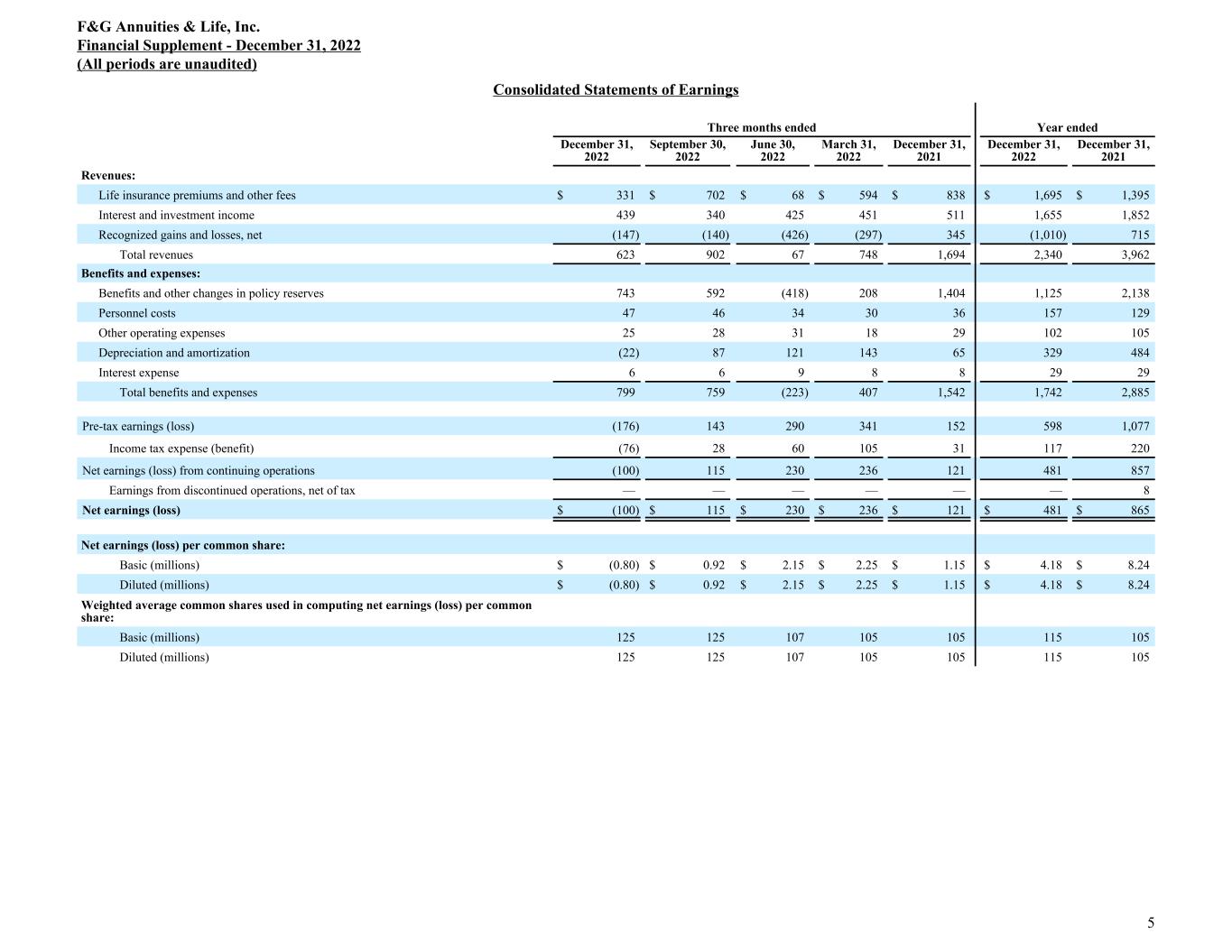 Consolidated Statements of Earnings Three months ended Year ended December 31, 2022 September 30, 2022 June 30, 2022 March 31, 2022 December 31, 2021 December 31, 2022 December 31, 2021 Revenues: Life insurance premiums and other fees $ 331 $ 702 $ 68 $ 594 $ 838 $ 1,695 $ 1,395 Interest and investment income 439 340 425 451 511 1,655 1,852 Recognized gains and losses, net (147) (140) (426) (297) 345 (1,010) 715 Total revenues 623 902 67 748 1,694 2,340 3,962 Benefits and expenses: Benefits and other changes in policy reserves 743 592 (418) 208 1,404 1,125 2,138 Personnel costs 47 46 34 30 36 157 129 Other operating expenses 25 28 31 18 29 102 105 Depreciation and amortization (22) 87 121 143 65 329 484 Interest expense 6 6 9 8 8 29 29 Total benefits and expenses 799 759 (223) 407 1,542 1,742 2,885 Pre-tax earnings (loss) (176) 143 290 341 152 598 1,077 Income tax expense (benefit) (76) 28 60 105 31 117 220 Net earnings (loss) from continuing operations (100) 115 230 236 121 481 857 Earnings from discontinued operations, net of tax — — — — — — 8 Net earnings (loss) $ (100) $ 115 $ 230 0 $ 236 $ 121 $ 481 $ 865 Net earnings (loss) per common share: Basic (millions) $ (0.80) $ 0.92 $ 2.15 $ 2.25 $ 1.15 $ 4.18 $ 8.24 Diluted (millions) $ (0.80) $ 0.92 $ 2.15 $ 2.25 $ 1.15 $ 4.18 $ 8.24 Weighted average common shares used in computing net earnings (loss) per common share: Basic (millions) 125 125 107 105 105 115 105 Diluted (millions) 125 125 107 105 105 115 105 F&G Annuities & Life, Inc. Financial Supplement - December 31, 2022 (All periods are unaudited) 5