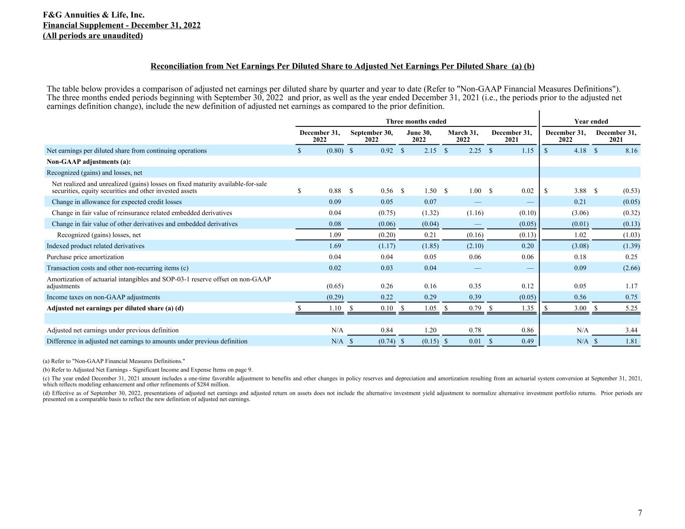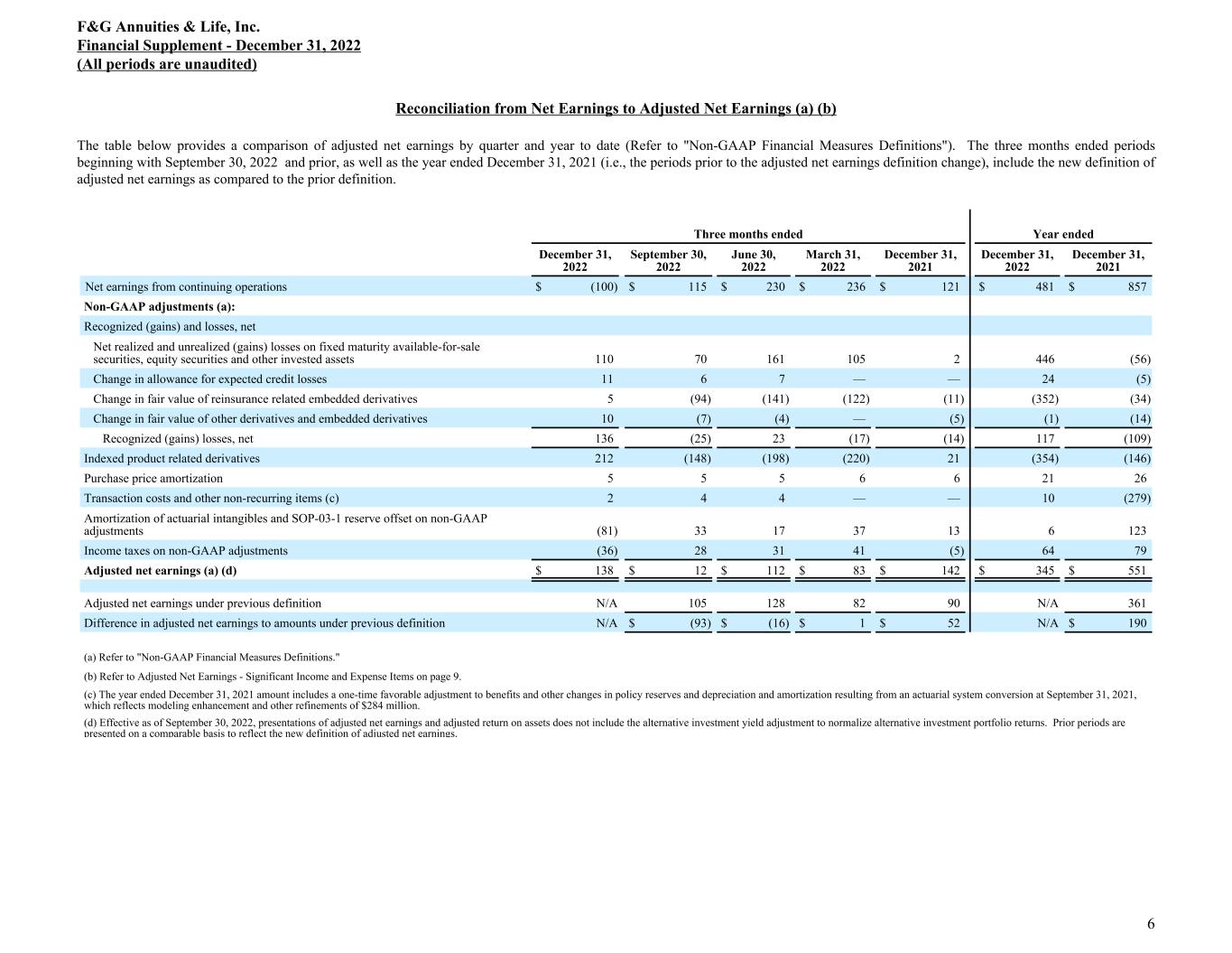 Reconciliation from Net Earnings to Adjusted Net Earnings (a) (b) The table below provides a comparison of adjusted net earnings by quarter and year to date (Refer to "Non-GAAP Financial Measures Definitions"). The three months ended periods beginning with September 30, 2022 and prior, as well as the year ended December 31, 2021 (i.e., the periods prior to the adjusted net earnings definition change), include the new definition of adjusted net earnings as compared to the prior definition. Three months ended Year ended December 31, 2022 September 30, 2022 June 30, 2022 March 31, 2022 December 31, 2021 December 31, 2022 December 31, 2021 Net earnings from continuing operations $ (100) $ 115 $ 230 $ 236 $ 121 $ 481 $ 857 Non-GAAP adjustments (a): Recognized (gains) and losses, net Net realized and unrealized (gains) losses on fixed maturity available-for-sale securities, equity securities and other invested assets 110 70 161 105 2 446 (56) Change in allowance for expected credit losses 11 6 7 — — 24 (5) Change in fair value of reinsurance related embedded derivatives 5 (94) (141) (122) (11) (352) (34) Change in fair value of other derivatives and embedded derivatives 10 (7) (4) — (5) (1) (14) Recognized (gains) losses, net 136 (25) 23 (17) (14) 117 (109) Indexed product related derivatives 212 (148) (198) (220) 21 (354) (146) Purchase price amortization 5 5 5 6 6 21 26 Transaction costs and other non-recurring items (c) 2 4 4 — — 10 (279) Amortization of actuarial intangibles and SOP-03-1 reserve offset on non-GAAP adjustments (81) 33 17 37 13 6 123 Income taxes on non-GAAP adjustments (36) 28 31 41 (5) 64 79 Adjusted net earnings (a) (d) $ 138 $ 12 $ 112 $ 83 $ — $ 142 $ 345 $ 551 Adjusted net earnings under previous definition N/A 105 128 82 90 N/A 361 Difference in adjusted net earnings to amounts under previous definition N/A $ (93) $ (16) $ 1 $ 52 N/A $ 190 (a) Refer to "Non-GAAP Financial Measures Definitions." (b) Refer to Adjusted Net Earnings - Significant Income and Expense Items on page 9. (c) The year ended December 31, 2021 amount includes a one-time favorable adjustment to benefits and other changes in policy reserves and depreciation and amortization resulting from an actuarial system conversion at September 31, 2021, which reflects modeling enhancement and other refinements of $284 million. (d) Effective as of September 30, 2022, presentations of adjusted net earnings and adjusted return on assets does not include the alternative investment yield adjustment to normalize alternative investment portfolio returns. Prior periods are presented on a comparable basis to reflect the new definition of adjusted net earnings. F&G Annuities & Life, Inc. Financial Supplement - December 31, 2022 (All periods are unaudited) 6