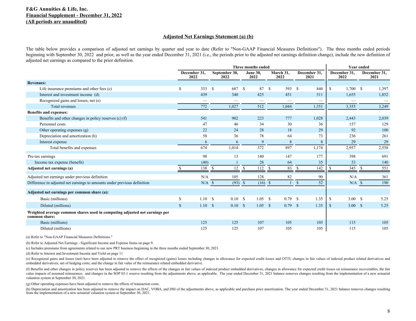 Adjusted Net Earnings Statement (a) (b) The table below provides a comparison of adjusted net earnings by quarter and year to date (Refer to "Non-GAAP Financial Measures Definitions"). The three months ended periods beginning with September 30, 2022 and prior, as well as the year ended December 31, 2021 (i.e., the periods prior to the adjusted net earnings definition change), include the new definition of adjusted net earnings as compared to the prior definition. Three months ended Year ended December 31, 2022 September 30, 2022 June 30, 2022 March 31, 2022 December 31, 2021 December 31, 2022 December 31, 2021 Revenues: Life insurance premiums and other fees (c) $ 333 $ 687 $ 87 $ 593 $ 840 $ 1,700 $ 1,397 Interest and investment income (d) 439 340 425 451 511 1,655 1,852 Recognized gains and losses, net (e) — — — — — — — Total revenues 772 1,027 512 1,044 1,351 3,355 3,249 Benefits and expenses: Benefits and other changes in policy reserves (c) (f) 541 902 223 777 1,028 2,443 2,039 Personnel costs 47 46 34 30 36 157 129 Other operating expenses (g) 22 24 28 18 29 92 100 Depreciation and amortization (h) 58 36 78 64 73 236 261 Interest expense 6 6 9 8 8 29 29 Total benefits and expenses 674 1,014 372 897 1,174 2,957 2,558 Pre-tax earnings 98 13 140 147 177 398 691 Income tax expense (benefit) (40) 1 28 64 35 53 140 Adjusted net earnings (a) $ 138 $ 12 $ 112 $ 83 $ 142 $ 345 $ 551 Adjusted net earnings under previous definition N/A 105 128 82 90 N/A 361 Difference in adjusted net earnings to amounts under previous definition N/A $ (93) $ (16) $ 1 $ 52 N/A $ 190 Adjusted net earnings per common share (a): Basic (millions) $ 1.10 $ 0.10 $ 1.05 $ 0.79 $ 1.35 $ 3.00 $ 5.25 Diluted (millions) $ 1.10 $ 0.10 $ 1.05 $ 0.79 $ 1.35 $ 3.00 $ 5.25 Weighted average common shares used in computing adjusted net earnings per common share: Basic (millions) 125 125 107 105 105 115 105 Diluted (millions) 125 125 107 105 105 115 105 (a) Refer to "Non-GAAP Financial Measures Definitions." (b) Refer to Adjusted Net Earnings - Significant Income and Expense Items on page 9. (c) Includes premiums from agreements related to our new PRT business beginning in the three months ended September 30, 2021. (d) Refer to Interest and Investment Income and Yield on page 11 (e) Recognized gains and losses (net) have been adjusted to remove the effect of recognized (gains) losses including changes in allowance for expected credit losses and OTTI; changes in fair values of indexed product related derivatives and embedded derivatives, net of hedging costs; and the change in fair value of the reinsurance related embedded derivative. (f) Benefits and other changes in policy reserves has been adjusted to remove the effects of the changes in fair values of indexed product embedded derivatives, changes in allowance for expected credit losses on reinsurance recoverables, the fair value impacts of assumed reinsurance, and changes in the SOP 03-1 reserve resulting from the adjustments above, as applicable. The year ended December 31, 2021 balance removes changes resulting from the implementation of a new actuarial valuation system at September 30, 2021. (g) Other operating expenses have been adjusted to remove the effects of transaction costs. (h) Depreciation and amortization has been adjusted to remove the impact on DAC, VOBA, and DSI of the adjustments above, as applicable and purchase price amortization. The year ended December 31, 2021 balance removes changes resulting from the implementation of a new actuarial valuation system at September 30, 2021. F&G Annuities & Life, Inc. Financial Supplement - December 31, 2022 (All periods are unaudited) 8