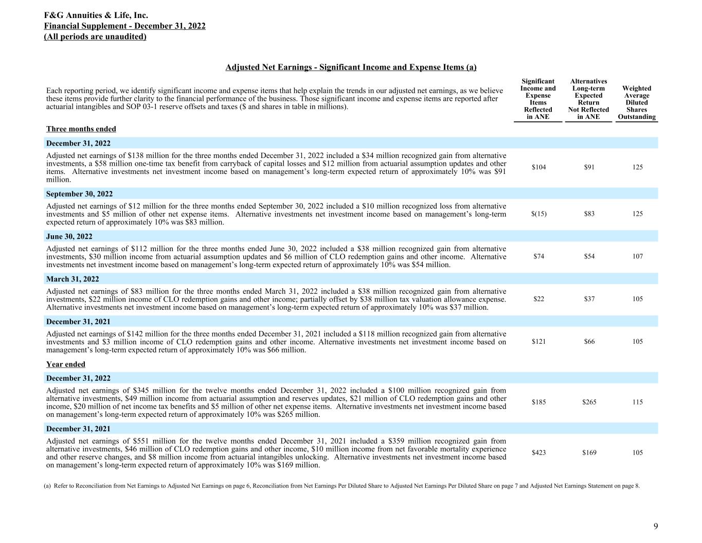 Adjusted Net Earnings - Significant Income and Expense Items (a) Each reporting period, we identify significant income and expense items that help explain the trends in our adjusted net earnings, as we believe these items provide further clarity to the financial performance of the business. Those significant income and expense items are reported after actuarial intangibles and SOP 03-1 reserve offsets and taxes ($ and shares in table in millions). Significant Income and Expense Items Reflected in ANE Alternatives Long-term Expected Return Not Reflected in ANE Weighted Average Diluted Shares Outstanding Three months ended December 31, 2022 Adjusted net earnings of $138 million for the three months ended December 31, 2022 included a $34 million recognized gain from alternative investments, a $58 million one-time tax benefit from carryback of capital losses and $12 million from actuarial assumption updates and other items. Alternative investments net investment income based on management’s long-term expected return of approximately 10% was $91 million. $104 $91 125 September 30, 2022 Adjusted net earnings of $12 million for the three months ended September 30, 2022 included a $10 million recognized loss from alternative investments and $5 million of other net expense items. Alternative investments net investment income based on management’s long-term expected return of approximately 10% was $83 million. $(15) $83 125 June 30, 2022 Adjusted net earnings of $112 million for the three months ended June 30, 2022 included a $38 million recognized gain from alternative investments, $30 million income from actuarial assumption updates and $6 million of CLO redemption gains and other income. Alternative investments net investment income based on management’s long-term expected return of approximately 10% was $54 million. $74 $54 107 March 31, 2022 Adjusted net earnings of $83 million for the three months ended March 31, 2022 included a $38 million recognized gain from alternative investments, $22 million income of CLO redemption gains and other income; partially offset by $38 million tax valuation allowance expense. Alternative investments net investment income based on management’s long-term expected return of approximately 10% was $37 million. $22 $37 105 December 31, 2021 Adjusted net earnings of $142 million for the three months ended December 31, 2021 included a $118 million recognized gain from alternative investments and $3 million income of CLO redemption gains and other income. Alternative investments net investment income based on management’s long-term expected return of approximately 10% was $66 million. $121 $66 105 Year ended December 31, 2022 Adjusted net earnings of $345 million for the twelve months ended December 31, 2022 included a $100 million recognized gain from alternative investments, $49 million income from actuarial assumption and reserves updates, $21 million of CLO redemption gains and other income, $20 million of net income tax benefits and $5 million of other net expense items. Alternative investments net investment income based on management’s long-term expected return of approximately 10% was $265 million. $185 $265 115 December 31, 2021 Adjusted net earnings of $551 million for the twelve months ended December 31, 2021 included a $359 million recognized gain from alternative investments, $46 million of CLO redemption gains and other income, $10 million income from net favorable mortality experience and other reserve changes, and $8 million income from actuarial intangibles unlocking. Alternative investments net investment income based on management’s long-term expected return of approximately 10% was $169 million. $423 $169 105 (a) Refer to Reconciliation from Net Earnings to Adjusted Net Earnings on page 6, Reconciliation from Net Earnings Per Diluted Share to Adjusted Net Earnings Per Diluted Share on page 7 and Adjusted Net Earnings Statement on page 8. F&G Annuities & Life, Inc. Financial Supplement - December 31, 2022 (All periods are unaudited) 9