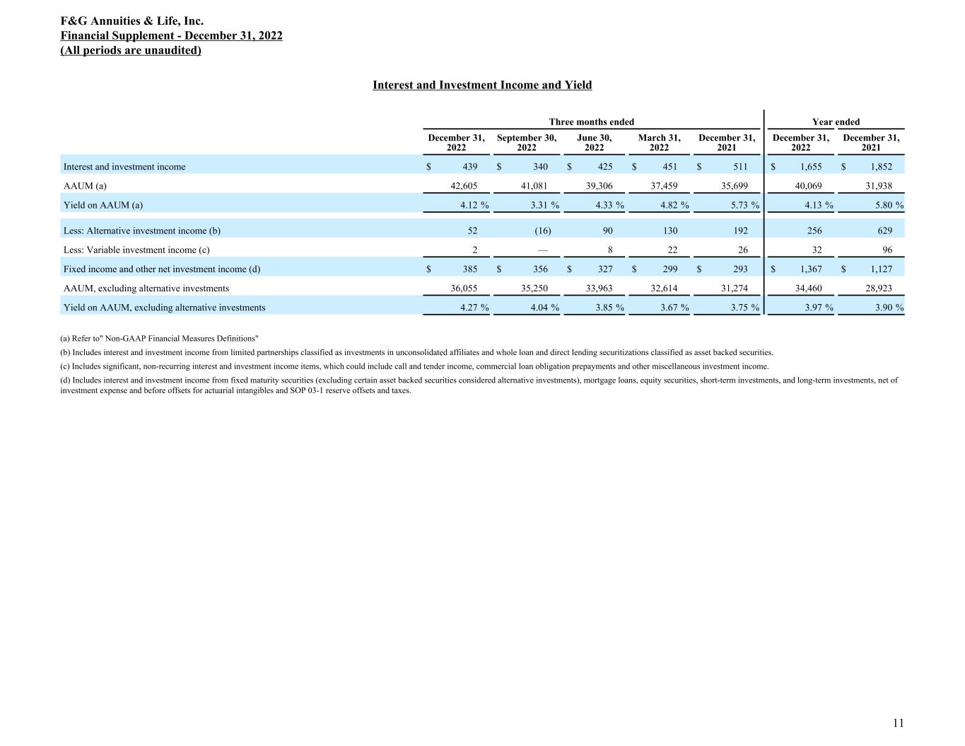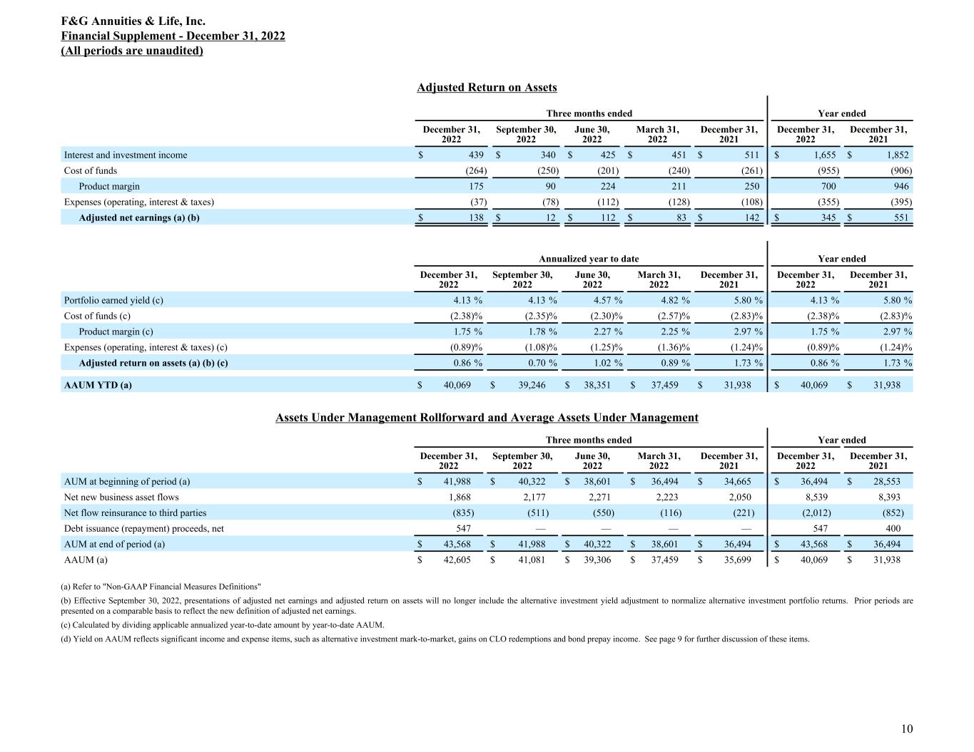 Adjusted Return on Assets Three months ended Year ended December 31, 2022 September 30, 2022 June 30, 2022 March 31, 2022 December 31, 2021 December 31, 2022 December 31, 2021 Interest and investment income $ 439 $ 340 $ 425 $ 451 $ 511 $ 1,655 $ 1,852 Cost of funds (264) (250) (201) (240) (261) (955) (906) Product margin 175 90 224 211 250 700 946 Expenses (operating, interest & taxes) (37) (78) (112) (128) (108) (355) (395) Adjusted net earnings (a) (b) $ 138 $ 12 $ 112 $ 83 $ 142 $ 345 $ 551 Annualized year to date Year ended December 31, 2022 September 30, 2022 June 30, 2022 March 31, 2022 December 31, 2021 December 31, 2022 December 31, 2021 Portfolio earned yield (c) 4.13 % 4.13 % 4.57 % 4.82 % 5.80 % 4.13 % 5.80 % Cost of funds (c) (2.38) % (2.35) % (2.30) % (2.57) % (2.83) % (2.38) % (2.83) % Product margin (c) 1.75 % 1.78 % 2.27 % 2.25 % 2.97 % 1.75 % 2.97 % Expenses (operating, interest & taxes) (c) (0.89) % (1.08) % (1.25) % (1.36) % (1.24) % (0.89) % (1.24) % Adjusted return on assets (a) (b) (c) 0.86 % 0.70 % 1.02 % 0.89 % 1.73 % 0.86 % 1.73 % AAUM YTD (a) $ 40,069 $ 39,246 $ 38,351 $ 37,459 $ 31,938 $ 40,069 $ 31,938 Assets Under Management Rollforward and Average Assets Under Management Three months ended Year ended December 31, 2022 September 30, 2022 June 30, 2022 March 31, 2022 December 31, 2021 December 31, 2022 December 31, 2021 AUM at beginning of period (a) $ 41,988 $ 40,322 $ 38,601 $ 36,494 $ 34,665 $ 36,494 $ 28,553 Net new business asset flows 1,868 2,177 2,271 2,223 2,050 8,539 8,393 Net flow reinsurance to third parties (835) (511) (550) (116) (221) (2,012) (852) Debt issuance (repayment) proceeds, net 547 — — — — 547 400 AUM at end of period (a) $ 43,568 $ 41,988 $ 40,322 $ 38,601 $ 36,494 $ 43,568 $ 36,494 AAUM (a) $ 42,605 $ 41,081 $ 39,306 $ 37,459 $ 35,699 $ 40,069 $ 31,938 (a) Refer to "Non-GAAP Financial Measures Definitions" (b) Effective September 30, 2022, presentations of adjusted net earnings and adjusted return on assets will no longer include the alternative investment yield adjustment to normalize alternative investment portfolio returns. Prior periods are presented on a comparable basis to reflect the new definition of adjusted net earnings. (c) Calculated by dividing applicable annualized year-to-date amount by year-to-date AAUM. (d) Yield on AAUM reflects significant income and expense items, such as alternative investment mark-to-market, gains on CLO redemptions and bond prepay income. See page 9 for further discussion of these items. F&G Annuities & Life, Inc. Financial Supplement - December 31, 2022 (All periods are unaudited) 10