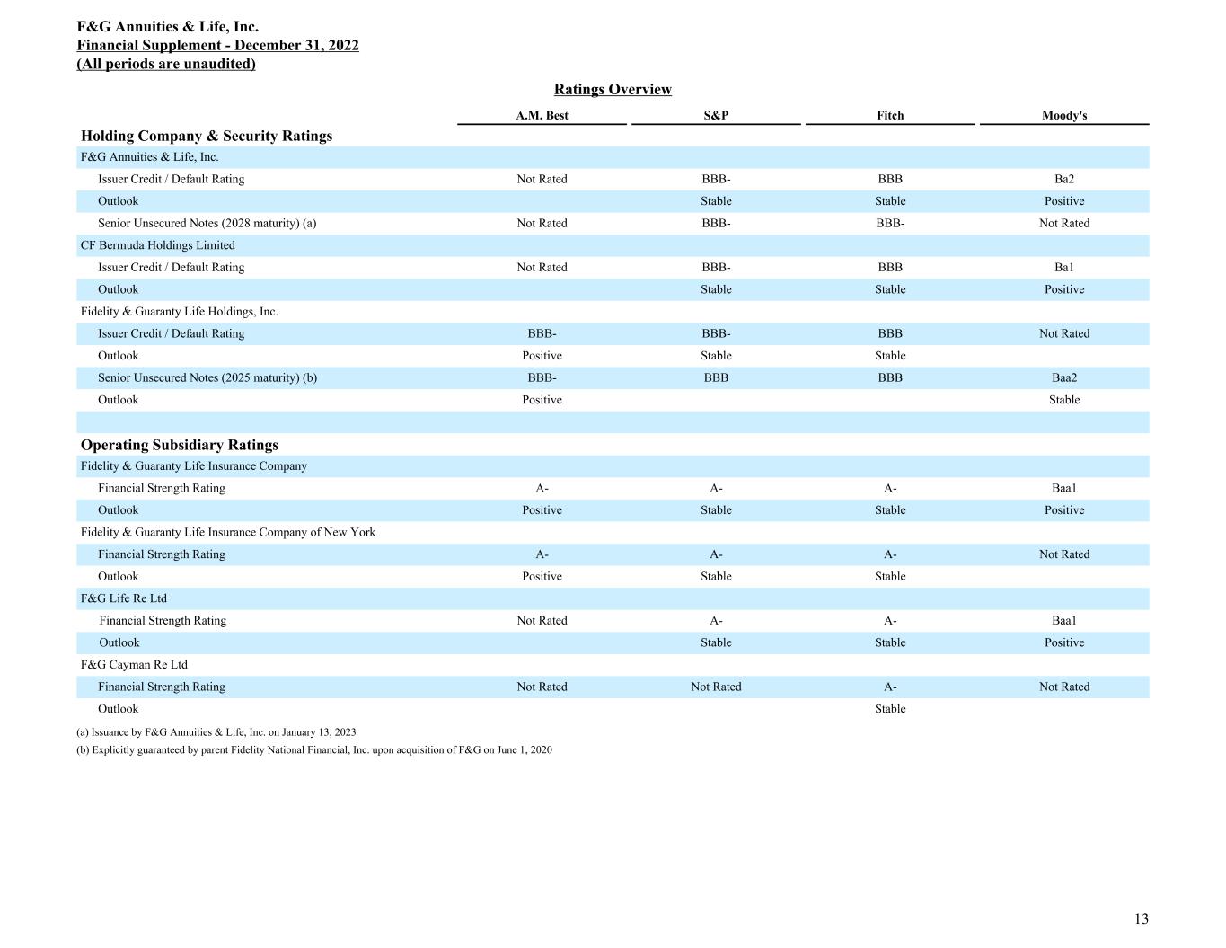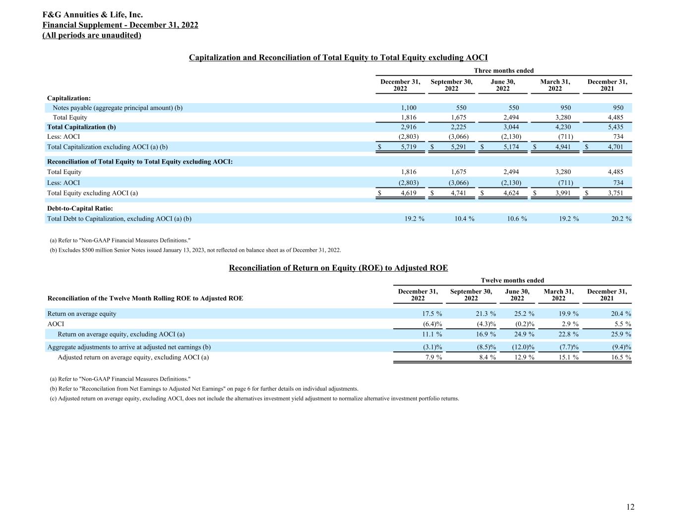 Capitalization and Reconciliation of Total Equity to Total Equity excluding AOCI Three months ended December 31, 2022 September 30, 2022 June 30, 2022 March 31, 2022 December 31, 2021 Capitalization: Notes payable (aggregate principal amount) (b) 1,100 550 550 950 950 Total Equity 1,816 1,675 2,494 3,280 4,485 Total Capitalization (b) 2,916 2,225 3,044 4,230 5,435 Less: AOCI (2,803) (3,066) (2,130) (711) 734 Total Capitalization excluding AOCI (a) (b) $ 5,719 $ 5,291 $ 5,174 $ 4,941 $ 4,701 Reconciliation of Total Equity to Total Equity excluding AOCI: Total Equity 1,816 1,675 2,494 3,280 4,485 Less: AOCI (2,803) (3,066) (2,130) (711) 734 Total Equity excluding AOCI (a) $ 4,619 $ 4,741 $ 4,624 $ 3,991 $ 3,751 Debt-to-Capital Ratio: Total Debt to Capitalization, excluding AOCI (a) (b) 19.2 % 10.4 % 10.6 % 19.2 % 20.2 % (a) Refer to "Non-GAAP Financial Measures Definitions." (b) Excludes $500 million Senior Notes issued January 13, 2023, not reflected on balance sheet as of December 31, 2022. Reconciliation of Return on Equity (ROE) to Adjusted ROE Twelve months ended Reconciliation of the Twelve Month Rolling ROE to Adjusted ROE December 31, 2022 September 30, 2022 June 30, 2022 March 31, 2022 December 31, 2021 Return on average equity 17.5 % 21.3 % 25.2 % 19.9 % 20.4 % AOCI (6.4) % (4.3) % (0.2) % 2.9 % 5.5 % Return on average equity, excluding AOCI (a) 11.1 % 16.9 % 24.9 % 22.8 % 25.9 % Aggregate adjustments to arrive at adjusted net earnings (b) (3.1) % (8.5) % (12.0) % (7.7) % (9.4) % Adjusted return on average equity, excluding AOCI (a) 7.9 % 8.4 % 12.9 % 15.1 % 16.5 % (a) Refer to "Non-GAAP Financial Measures Definitions." (b) Refer to "Reconcilation from Net Earnings to Adjusted Net Earnings" on page 6 for further details on individual adjustments. (c) Adjusted return on average equity, excluding AOCI, does not include the alternatives investment yield adjustment to normalize alternative investment portfolio returns. F&G Annuities & Life, Inc. Financial Supplement - December 31, 2022 (All periods are unaudited) 12