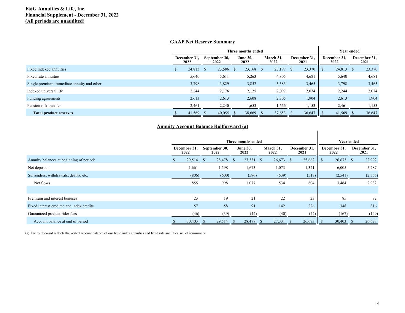 GAAP Net Reserve Summary Three months ended Year ended December 31, 2022 September 30, 2022 June 30, 2022 March 31, 2022 December 31, 2021 December 31, 2022 December 31, 2021 Fixed indexed annuities $ 24,813 $ 23,586 $ 23,168 $ 23,197 $ 23,370 $ 24,813 $ 23,370 Fixed rate annuities 5,640 5,611 5,263 4,805 4,681 5,640 4,681 Single premium immediate annuity and other 3,798 3,829 3,852 3,583 3,465 3,798 3,465 Indexed universal life 2,244 2,176 2,125 2,097 2,074 2,244 2,074 Funding agreements 2,613 2,613 2,608 2,305 1,904 2,613 1,904 Pension risk transfer 2,461 2,240 1,653 1,666 1,153 2,461 1,153 Total product reserves $ 41,569 $ 40,055 $ 38,669 $ 37,653 $ 36,647 $ 41,569 $ 36,647 Annuity Account Balance Rollforward (a) Three months ended Year ended December 31, 2022 September 30, 2022 June 30, 2022 March 31, 2022 December 31, 2021 December 31, 2022 December 31, 2021 Annuity balances at beginning of period: $ 29,514 $ 28,478 $ 27,331 $ 26,673 $ 25,662 $ 26,673 $ 22,992 Net deposits 1,661 1,598 1,673 1,073 1,321 6,005 5,287 Surrenders, withdrawals, deaths, etc. (806) (600) (596) (539) (517) (2,541) (2,355) Net flows 855 998 1,077 534 804 3,464 2,932 Premium and interest bonuses 23 19 21 22 23 85 82 Fixed interest credited and index credits 57 58 91 142 226 348 816 Guaranteed product rider fees (46) (39) (42) (40) (42) (167) (149) Account balance at end of period $ 30,403 $ 29,514 $ 28,478 $ 27,331 $ 26,673 $ 30,403 $ 26,673 (a) The rollforward reflects the vested account balance of our fixed index annuities and fixed rate annuities, net of reinsurance. F&G Annuities & Life, Inc. Financial Supplement - December 31, 2022 (All periods are unaudited) 14