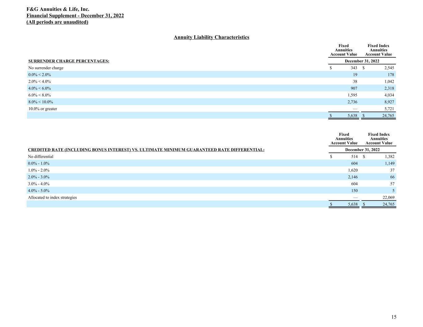 Annuity Liability Characteristics Fixed Annuities Account Value Fixed Index Annuities Account Value SURRENDER CHARGE PERCENTAGES: December 31, 2022 No surrender charge $ 343 $ 2,545 0.0% < 2.0% 19 178 2.0% < 4.0% 38 1,042 4.0% < 6.0% 907 2,318 6.0% < 8.0% 1,595 4,034 8.0% < 10.0% 2,736 8,927 10.0% or greater — 5,721 $ 5,638 $ 24,765 Fixed Annuities Account Value Fixed Index Annuities Account Value CREDITED RATE (INCLUDING BONUS INTEREST) VS. ULTIMATE MINIMUM GUARANTEED RATE DIFFERENTIAL: December 31, 2022 No differential $ 514 $ 1,382 0.0% - 1.0% 604 1,149 1.0% - 2.0% 1,620 37 2.0% - 3.0% 2,146 66 3.0% - 4.0% 604 57 4.0% - 5.0% 150 5 Allocated to index strategies — 22,069 $ 5,638 $ 24,765 F&G Annuities & Life, Inc. Financial Supplement - December 31, 2022 (All periods are unaudited) 15