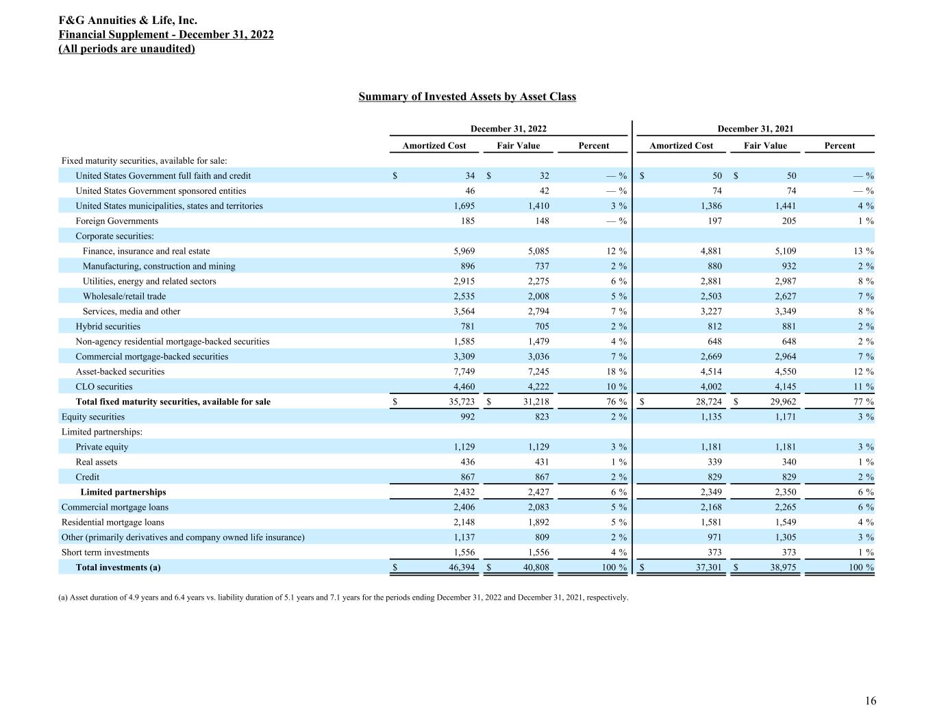 Summary of Invested Assets by Asset Class December 31, 2022 December 31, 2021 Amortized Cost Fair Value Percent Amortized Cost Fair Value Percent Fixed maturity securities, available for sale: United States Government full faith and credit $ 34 $ 32 — % $ 50 $ 50 — % United States Government sponsored entities 46 42 — % 74 74 — % United States municipalities, states and territories 1,695 1,410 3 % 1,386 1,441 4 % Foreign Governments 185 148 — % 197 205 1 % Corporate securities: Finance, insurance and real estate 5,969 5,085 12 % 4,881 5,109 13 % Manufacturing, construction and mining 896 737 2 % 880 932 2 % Utilities, energy and related sectors 2,915 2,275 6 % 2,881 2,987 8 % Wholesale/retail trade 2,535 2,008 5 % 2,503 2,627 7 % Services, media and other 3,564 2,794 7 % 3,227 3,349 8 % Hybrid securities 781 705 2 % 812 881 2 % Non-agency residential mortgage-backed securities 1,585 1,479 4 % 648 648 2 % Commercial mortgage-backed securities 3,309 3,036 7 % 2,669 2,964 7 % Asset-backed securities 7,749 7,245 18 % 4,514 4,550 12 % CLO securities 4,460 4,222 10 % 4,002 4,145 11 % Total fixed maturity securities, available for sale $ 35,723 $ 31,218 76 % $ 28,724 $ 29,962 77 % Equity securities 992 823 2 % 1,135 1,171 3 % Limited partnerships: Private equity 1,129 1,129 3 % 1,181 1,181 3 % Real assets 436 431 1 % 339 340 1 % Credit 867 867 2 % 829 829 2 % Limited partnerships 2,432 2,427 6 % 2,349 2,350 6 % Commercial mortgage loans 2,406 2,083 5 % 2,168 2,265 6 % Residential mortgage loans 2,148 1,892 5 % 1,581 1,549 4 % Other (primarily derivatives and company owned life insurance) 1,137 809 2 % 971 1,305 3 % Short term investments 1,556 1,556 4 % 373 373 1 % Total investments (a) $ 46,394 $ 40,808 100 % $ 37,301 $ 38,975 100 % (a) Asset duration of 4.9 years and 6.4 years vs. liability duration of 5.1 years and 7.1 years for the periods ending December 31, 2022 and December 31, 2021, respectively. F&G Annuities & Life, Inc. Financial Supplement - December 31, 2022 (All periods are unaudited) 16