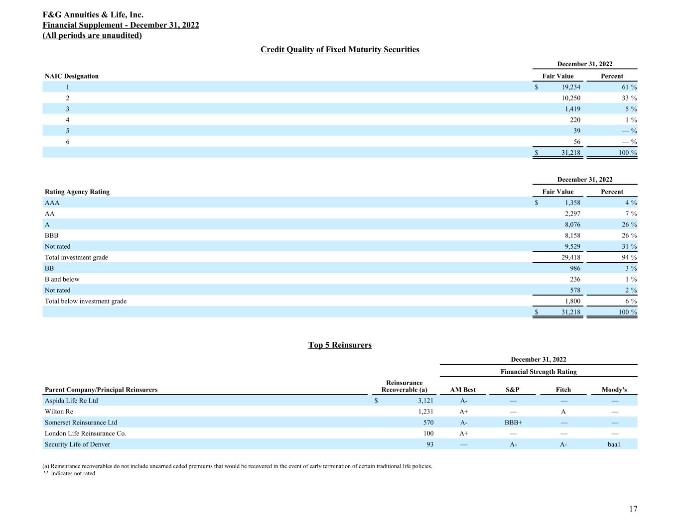 Credit Quality of Fixed Maturity Securities December 31, 2022 NAIC Designation Fair Value Percent 1 $ 19,234 61 % 2 10,250 33 % 3 1,419 5 % 4 220 1 % 5 39 — % 6 56 — % $ 31,218 100 % December 31, 2022 Rating Agency Rating Fair Value Percent AAA $ 1,358 4 % AA 2,297 7 % A 8,076 26 % BBB 8,158 26 % Not rated 9,529 31 % Total investment grade 29,418 94 % BB 986 3 % B and below 236 1 % Not rated 578 2 % Total below investment grade 1,800 6 % $ 31,218 100 % Top 5 Reinsurers December 31, 2022 Financial Strength Rating Parent Company/Principal Reinsurers Reinsurance Recoverable (a) AM Best S&P Fitch Moody's Aspida Life Re Ltd $ 3,121 A- — — — Wilton Re 1,231 A+ — A — Somerset Reinsurance Ltd 570 A- BBB+ — — London Life Reinsurance Co. 100 A+ — — — Security Life of Denver 93 — A- A- baa1 (a) Reinsurance recoverables do not include unearned ceded premiums that would be recovered in the event of early termination of certain traditional life policies. '-' indicates not rated F&G Annuities & Life, Inc. Financial Supplement - December 31, 2022 (All periods are unaudited) 17