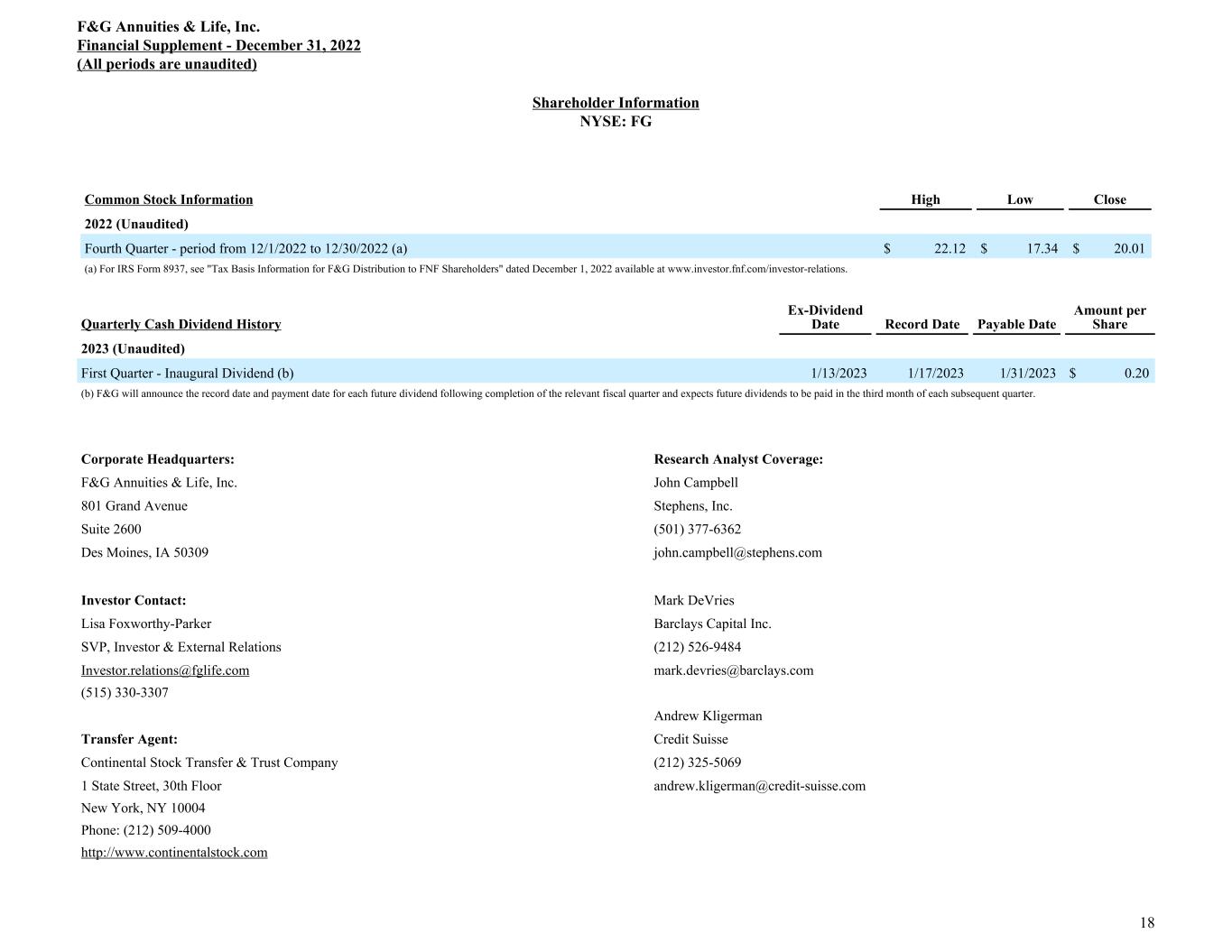 Shareholder Information NYSE: FG Common Stock Information High Low Close 2022 (Unaudited) Fourth Quarter - period from 12/1/2022 to 12/30/2022 (a) $ 22.12 $ 17.34 $ 20.01 (a) For IRS Form 8937, see "Tax Basis Information for F&G Distribution to FNF Shareholders" dated December 1, 2022 available at www.investor.fnf.com/investor-relations. Quarterly Cash Dividend History Ex-Dividend Date Record Date Payable Date Amount per Share 2023 (Unaudited) First Quarter - Inaugural Dividend (b) 1/13/2023 1/17/2023 1/31/2023 $ 0.20 (b) F&G will announce the record date and payment date for each future dividend following completion of the relevant fiscal quarter and expects future dividends to be paid in the third month of each subsequent quarter. Corporate Headquarters: Research Analyst Coverage: F&G Annuities & Life, Inc. John Campbell 801 Grand Avenue Stephens, Inc. Suite 2600 (501) 377-6362 Des Moines, IA 50309 john.campbell@stephens.com Investor Contact: Mark DeVries Lisa Foxworthy-Parker Barclays Capital Inc. SVP, Investor & External Relations (212) 526-9484 Investor.relations@fglife.com mark.devries@barclays.com (515) 330-3307 Andrew Kligerman Transfer Agent: Credit Suisse Continental Stock Transfer & Trust Company (212) 325-5069 1 State Street, 30th Floor andrew.kligerman@credit-suisse.com New York, NY 10004 Phone: (212) 509-4000 http://www.continentalstock.com F&G Annuities & Life, Inc. Financial Supplement - December 31, 2022 (All periods are unaudited) 18