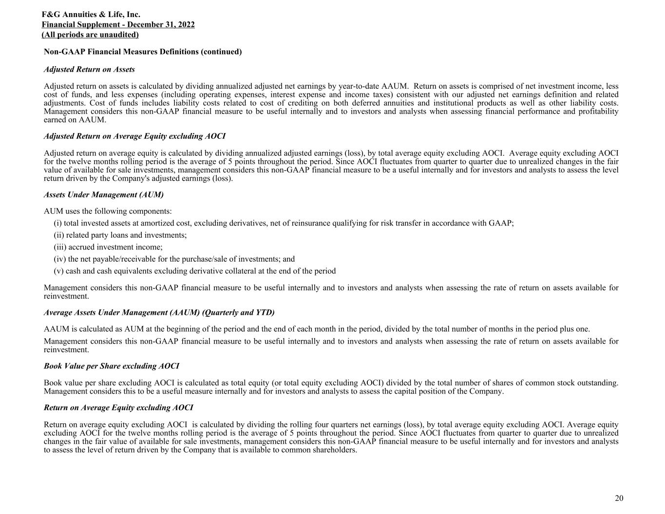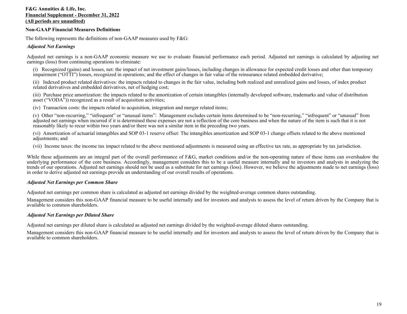 Non-GAAP Financial Measures Definitions The following represents the definitions of non-GAAP measures used by F&G: Adjusted Net Earnings Adjusted net earnings is a non-GAAP economic measure we use to evaluate financial performance each period. Adjusted net earnings is calculated by adjusting net earnings (loss) from continuing operations to eliminate: (i) Recognized (gains) and losses, net: the impact of net investment gains/losses, including changes in allowance for expected credit losses and other than temporary impairment (“OTTI”) losses, recognized in operations; and the effect of changes in fair value of the reinsurance related embedded derivative; (ii) Indexed product related derivatives: the impacts related to changes in the fair value, including both realized and unrealized gains and losses, of index product related derivatives and embedded derivatives, net of hedging cost; (iii) Purchase price amortization: the impacts related to the amortization of certain intangibles (internally developed software, trademarks and value of distribution asset (“VODA”)) recognized as a result of acquisition activities; (iv) Transaction costs: the impacts related to acquisition, integration and merger related items; (v) Other “non-recurring,” “infrequent” or “unusual items”: Management excludes certain items determined to be “non-recurring,” “infrequent” or “unusual” from adjusted net earnings when incurred if it is determined these expenses are not a reflection of the core business and when the nature of the item is such that it is not reasonably likely to recur within two years and/or there was not a similar item in the preceding two years. (vi) Amortization of actuarial intangibles and SOP 03-1 reserve offset: The intangibles amortization and SOP 03-1 change offsets related to the above mentioned adjustments; and (vii) Income taxes: the income tax impact related to the above mentioned adjustments is measured using an effective tax rate, as appropriate by tax jurisdiction. While these adjustments are an integral part of the overall performance of F&G, market conditions and/or the non-operating nature of these items can overshadow the underlying performance of the core business. Accordingly, management considers this to be a useful measure internally and to investors and analysts in analyzing the trends of our operations. Adjusted net earnings should not be used as a substitute for net earnings (loss). However, we believe the adjustments made to net earnings (loss) in order to derive adjusted net earnings provide an understanding of our overall results of operations. Adjusted Net Earnings per Common Share Adjusted net earnings per common share is calculated as adjusted net earnings divided by the weighted-average common shares outstanding. Management considers this non-GAAP financial measure to be useful internally and for investors and analysts to assess the level of return driven by the Company that is available to common shareholders. Adjusted Net Earnings per Diluted Share Adjusted net earnings per diluted share is calculated as adjusted net earnings divided by the weighted-average diluted shares outstanding. Management considers this non-GAAP financial measure to be useful internally and for investors and analysts to assess the level of return driven by the Company that is available to common shareholders. F&G Annuities & Life, Inc. Financial Supplement - December 31, 2022 (All periods are unaudited) 19