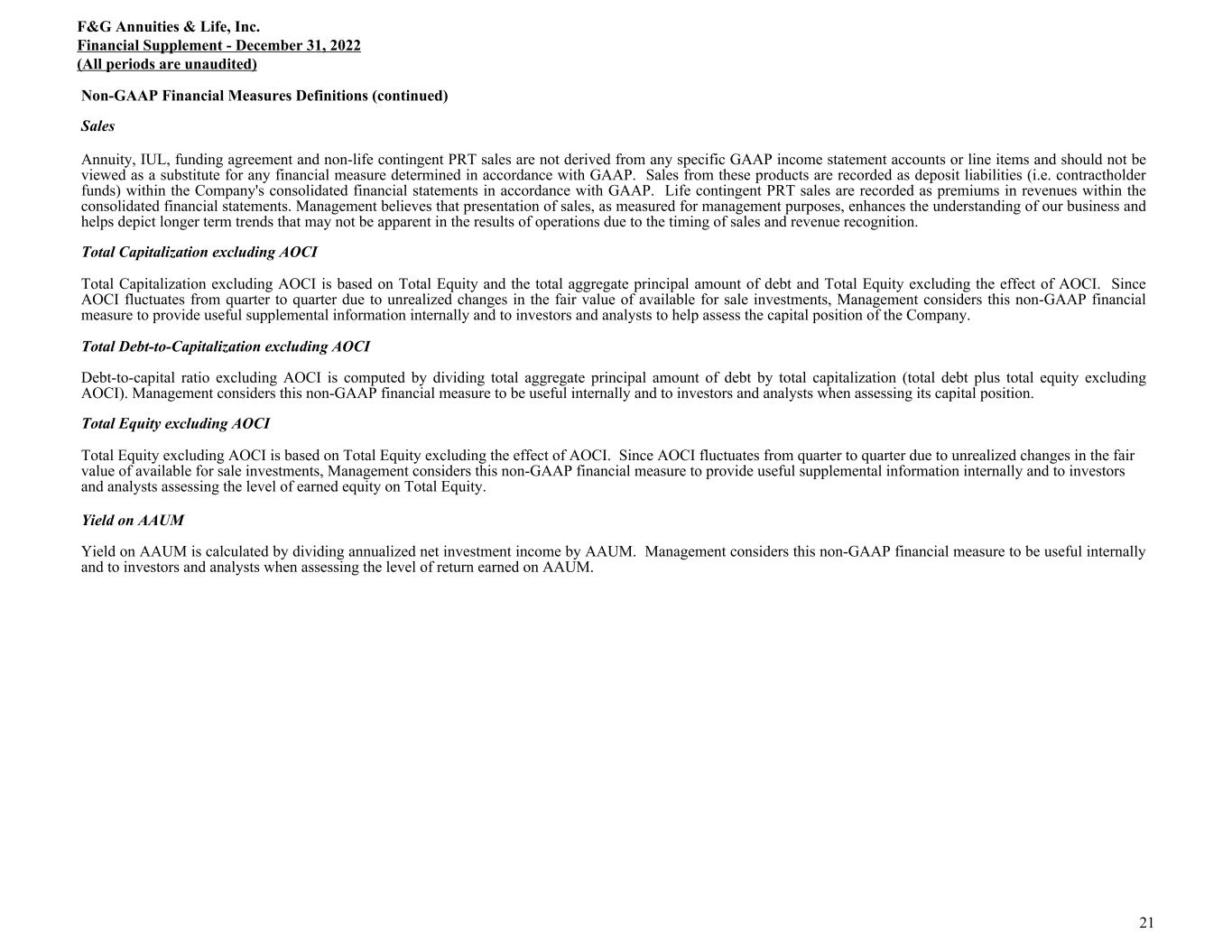 Non-GAAP Financial Measures Definitions (continued) Sales Annuity, IUL, funding agreement and non-life contingent PRT sales are not derived from any specific GAAP income statement accounts or line items and should not be viewed as a substitute for any financial measure determined in accordance with GAAP. Sales from these products are recorded as deposit liabilities (i.e. contractholder funds) within the Company's consolidated financial statements in accordance with GAAP. Life contingent PRT sales are recorded as premiums in revenues within the consolidated financial statements. Management believes that presentation of sales, as measured for management purposes, enhances the understanding of our business and helps depict longer term trends that may not be apparent in the results of operations due to the timing of sales and revenue recognition. Total Capitalization excluding AOCI Total Capitalization excluding AOCI is based on Total Equity and the total aggregate principal amount of debt and Total Equity excluding the effect of AOCI. Since AOCI fluctuates from quarter to quarter due to unrealized changes in the fair value of available for sale investments, Management considers this non-GAAP financial measure to provide useful supplemental information internally and to investors and analysts to help assess the capital position of the Company. Total Debt-to-Capitalization excluding AOCI Debt-to-capital ratio excluding AOCI is computed by dividing total aggregate principal amount of debt by total capitalization (total debt plus total equity excluding AOCI). Management considers this non-GAAP financial measure to be useful internally and to investors and analysts when assessing its capital position. Total Equity excluding AOCI Total Equity excluding AOCI is based on Total Equity excluding the effect of AOCI. Since AOCI fluctuates from quarter to quarter due to unrealized changes in the fair value of available for sale investments, Management considers this non-GAAP financial measure to provide useful supplemental information internally and to investors and analysts assessing the level of earned equity on Total Equity. Yield on AAUM Yield on AAUM is calculated by dividing annualized net investment income by AAUM. Management considers this non-GAAP financial measure to be useful internally and to investors and analysts when assessing the level of return earned on AAUM. F&G Annuities & Life, Inc. Financial Supplement - December 31, 2022 (All periods are unaudited) 21
