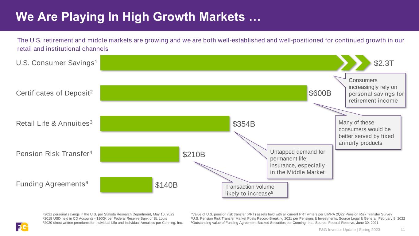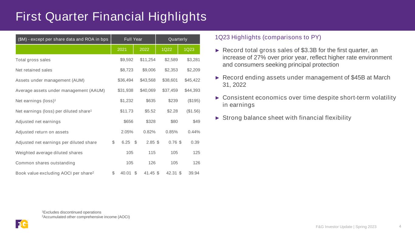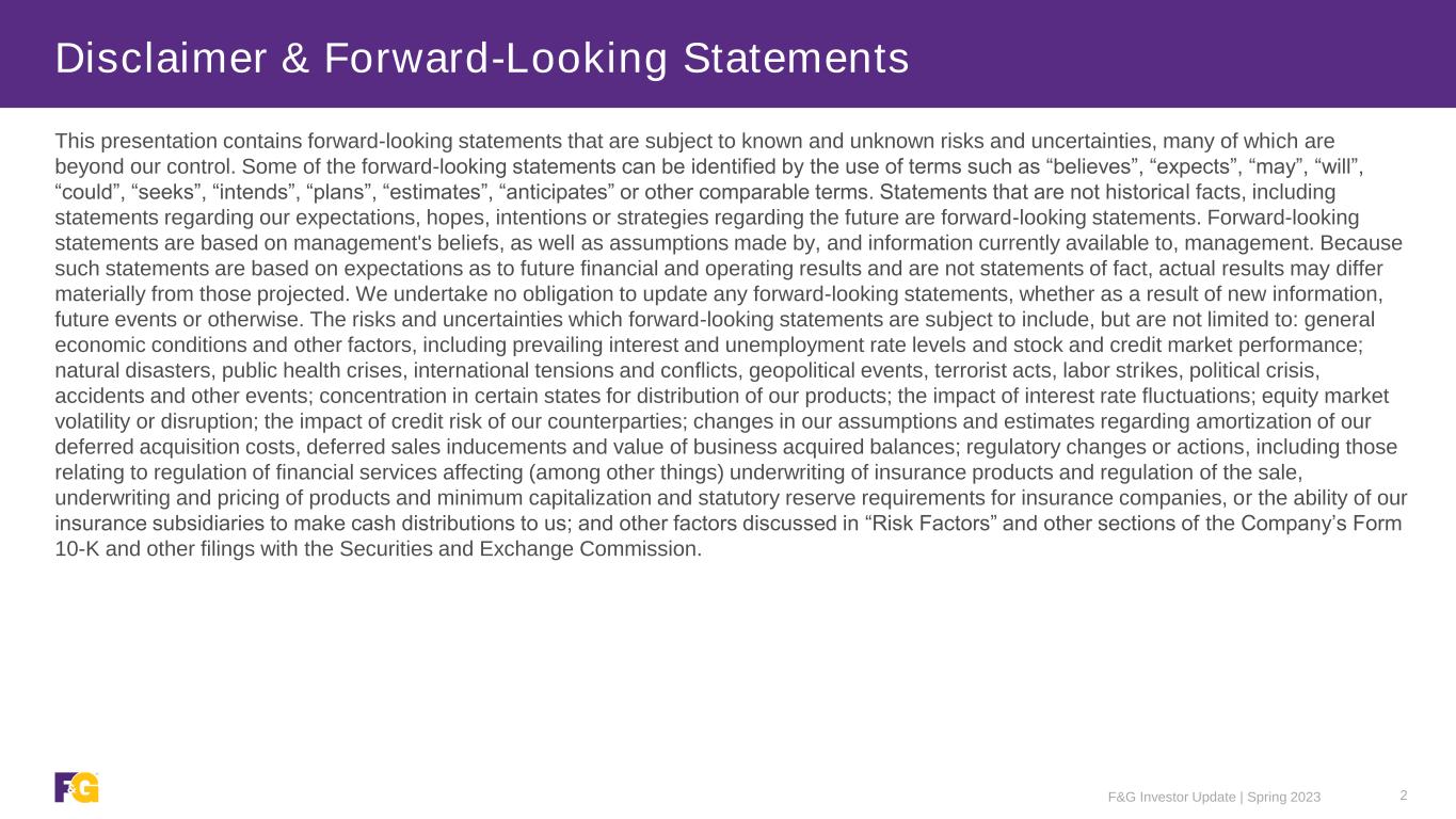 F&G Investor Update | Spring 2023 2 Disclaimer & Forward-Looking Statements This presentation contains forward-looking statements that are subject to known and unknown risks and uncertainties, many of which are beyond our control. Some of the forward-looking statements can be identified by the use of terms such as “believes”, “expects”, “may”, “will”, “could”, “seeks”, “intends”, “plans”, “estimates”, “anticipates” or other comparable terms. Statements that are not historical facts, including statements regarding our expectations, hopes, intentions or strategies regarding the future are forward-looking statements. Forward-looking statements are based on management's beliefs, as well as assumptions made by, and information currently available to, management. Because such statements are based on expectations as to future financial and operating results and are not statements of fact, actual results may differ materially from those projected. We undertake no obligation to update any forward-looking statements, whether as a result of new information, future events or otherwise. The risks and uncertainties which forward-looking statements are subject to include, but are not limited to: general economic conditions and other factors, including prevailing interest and unemployment rate levels and stock and credit market performance; natural disasters, public health crises, international tensions and conflicts, geopolitical events, terrorist acts, labor strikes, political crisis, accidents and other events; concentration in certain states for distribution of our products; the impact of interest rate fluctuations; equity market volatility or disruption; the impact of credit risk of our counterparties; changes in our assumptions and estimates regarding amortization of our deferred acquisition costs, deferred sales inducements and value of business acquired balances; regulatory changes or actions, including those relating to regulation of financial services affecting (among other things) underwriting of insurance products and regulation of the sale, underwriting and pricing of products and minimum capitalization and statutory reserve requirements for insurance companies, or the ability of our insurance subsidiaries to make cash distributions to us; and other factors discussed in “Risk Factors” and other sections of the Company’s Form 10-K and other filings with the Securities and Exchange Commission.