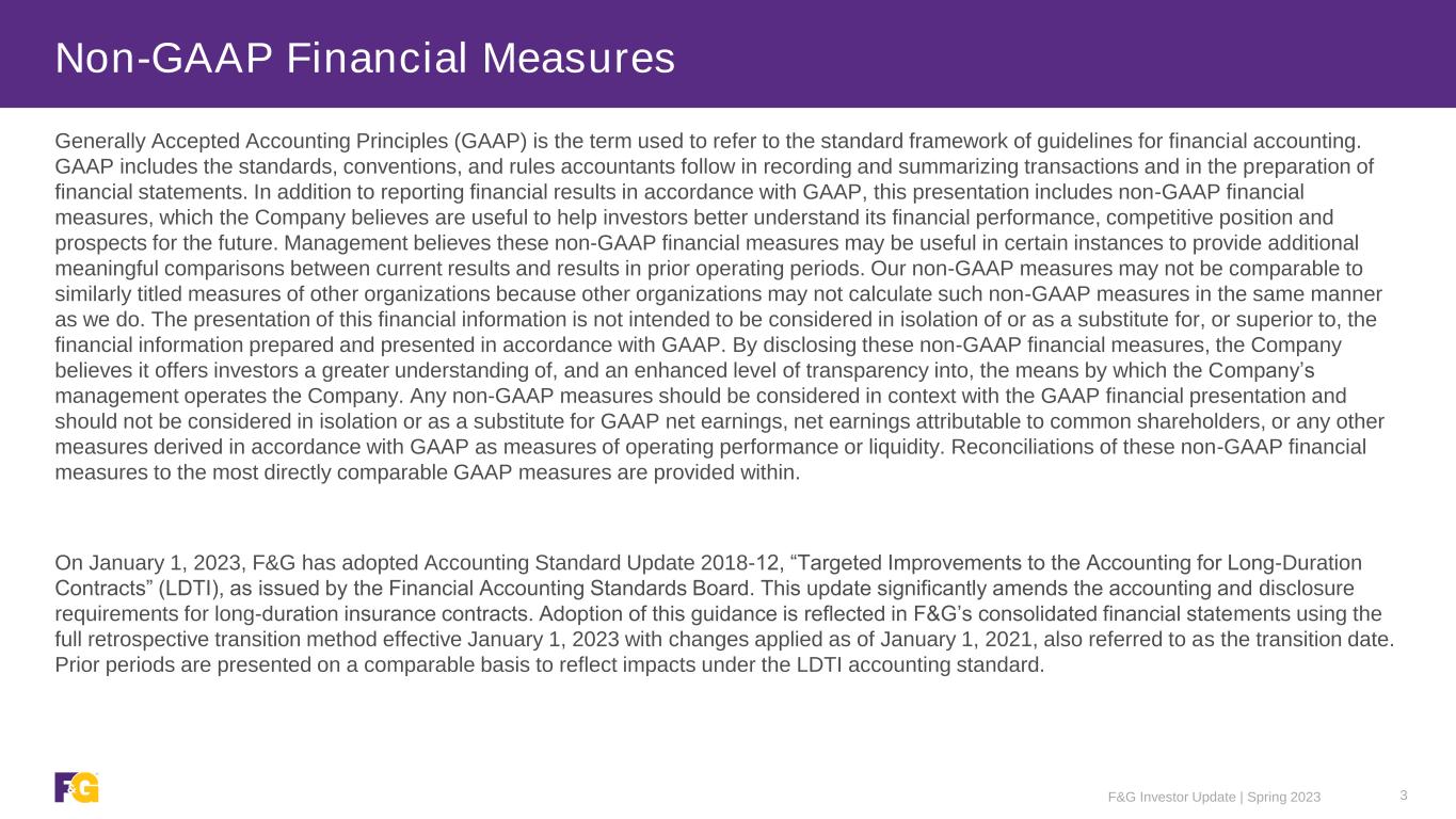 F&G Investor Update | Spring 2023 3 Non-GAAP Financial Measures Generally Accepted Accounting Principles (GAAP) is the term used to refer to the standard framework of guidelines for financial accounting. GAAP includes the standards, conventions, and rules accountants follow in recording and summarizing transactions and in the preparation of financial statements. In addition to reporting financial results in accordance with GAAP, this presentation includes non-GAAP financial measures, which the Company believes are useful to help investors better understand its financial performance, competitive position and prospects for the future. Management believes these non-GAAP financial measures may be useful in certain instances to provide additional meaningful comparisons between current results and results in prior operating periods. Our non-GAAP measures may not be comparable to similarly titled measures of other organizations because other organizations may not calculate such non-GAAP measures in the same manner as we do. The presentation of this financial information is not intended to be considered in isolation of or as a substitute for, or superior to, the financial information prepared and presented in accordance with GAAP. By disclosing these non-GAAP financial measures, the Company believes it offers investors a greater understanding of, and an enhanced level of transparency into, the means by which the Company’s management operates the Company. Any non-GAAP measures should be considered in context with the GAAP financial presentation and should not be considered in isolation or as a substitute for GAAP net earnings, net earnings attributable to common shareholders, or any other measures derived in accordance with GAAP as measures of operating performance or liquidity. Reconciliations of these non-GAAP financial measures to the most directly comparable GAAP measures are provided within. On January 1, 2023, F&G has adopted Accounting Standard Update 2018-12, “Targeted Improvements to the Accounting for Long-Duration Contracts” (LDTI), as issued by the Financial Accounting Standards Board. This update significantly amends the accounting and disclosure requirements for long-duration insurance contracts. Adoption of this guidance is reflected in F&G’s consolidated financial statements using the full retrospective transition method effective January 1, 2023 with changes applied as of January 1, 2021, also referred to as the transition date. Prior periods are presented on a comparable basis to reflect impacts under the LDTI accounting standard.