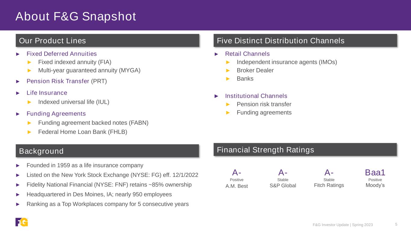 F&G Investor Update | Spring 2023 4 First Quarter Financial Highlights 1Q23 Highlights (comparisons to PY) ► Record total gross sales of $3.3B for the first quarter, an increase of 27% over prior year, reflect higher rate environment and consumers seeking principal protection ► Record ending assets under management of $45B at March 31, 2022 ► Consistent economics over time despite short-term volatility in earnings ► Strong balance sheet with financial flexibility ($M) - except per share data and ROA in bps Full Year Quarterly 2021 2022 1Q22 1Q23 Total gross sales $9,592 $11,254 $2,589 $3,281 Net retained sales $8,723 $9,006 $2,353 $2,209 Assets under management (AUM) $36,494 $43,568 $38,601 $45,422 Average assets under management (AAUM) $31,938 $40,069 $37,459 $44,393 Net earnings (loss)1 $1,232 $635 $239 ($195) Net earnings (loss) per diluted share1 $11.73 $5.52 $2.28 ($1.56) Adjusted net earnings $656 $328 $80 $49 Adjusted return on assets 2.05% 0.82% 0.85% 0.44% Adjusted net earnings per diluted share $ 6.25 $ 2.85 $ 0.76 $ 0.39 Weighted average diluted shares 105 115 105 125 Common shares outstanding 105 126 105 126 Book value excluding AOCI per share2 $ 40.01 $ 41.45 $ 42.31 $ 39.94 1Excludes discontinued operations 2Accumulated other comprehensive income (AOCI)