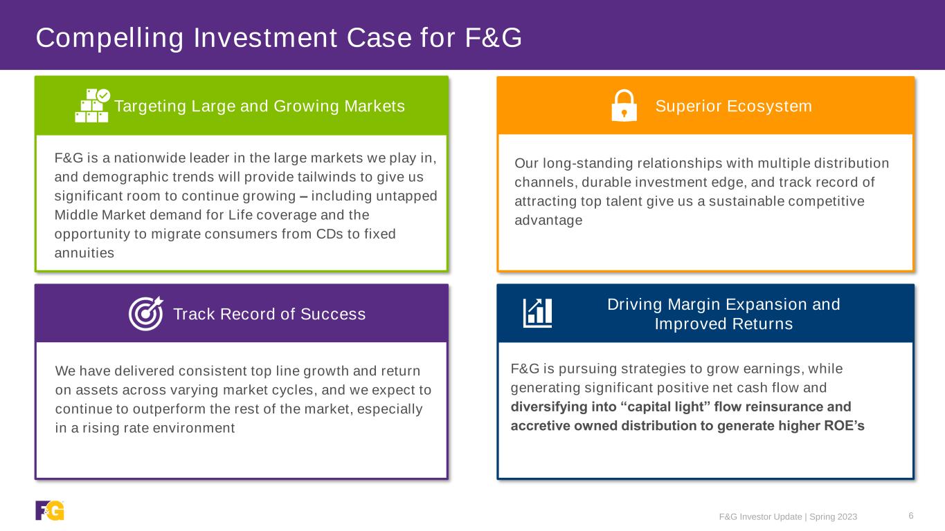 F&G Investor Update | Spring 2023 5 About F&G Snapshot Five Distinct Distribution ChannelsOur Product Lines ► Retail Channels ► Independent insurance agents (IMOs) ► Broker Dealer ► Banks ► Institutional Channels ► Pension risk transfer ► Funding agreements Background ► Founded in 1959 as a life insurance company ► Listed on the New York Stock Exchange (NYSE: FG) eff. 12/1/2022 ► Fidelity National Financial (NYSE: FNF) retains ~85% ownership ► Headquartered in Des Moines, IA; nearly 950 employees ► Ranking as a Top Workplaces company for 5 consecutive years ► Fixed Deferred Annuities ► Fixed indexed annuity (FIA) ► Multi-year guaranteed annuity (MYGA) ► Pension Risk Transfer (PRT) ► Life Insurance ► Indexed universal life (IUL) ► Funding Agreements ► Funding agreement backed notes (FABN) ► Federal Home Loan Bank (FHLB) A- Positive A.M. Best A- Stable S&P Global A- Stable Fitch Ratings Baa1 Positive Moody’s Financial Strength Ratings