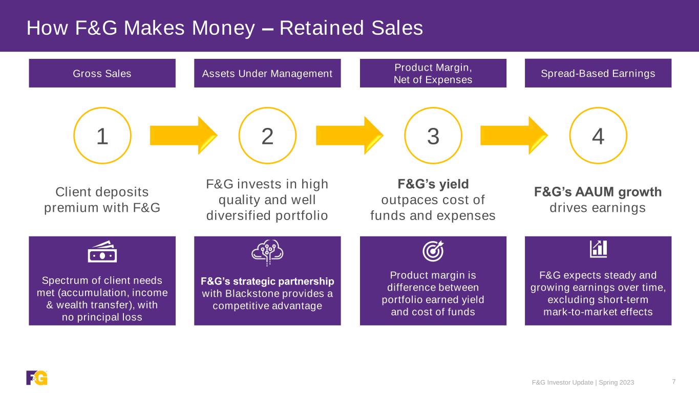 F&G Investor Update | Spring 2023 6 Compelling Investment Case for F&G Targeting Large and Growing Markets F&G is a nationwide leader in the large markets we play in, and demographic trends will provide tailwinds to give us significant room to continue growing – including untapped Middle Market demand for Life coverage and the opportunity to migrate consumers from CDs to fixed annuities Driving Margin Expansion and Improved Returns F&G is pursuing strategies to grow earnings, while generating significant positive net cash flow and diversifying into “capital light” flow reinsurance and accretive owned distribution to generate higher ROE’s Track Record of Success Superior Ecosystem Our long-standing relationships with multiple distribution channels, durable investment edge, and track record of attracting top talent give us a sustainable competitive advantage We have delivered consistent top line growth and return on assets across varying market cycles, and we expect to continue to outperform the rest of the market, especially in a rising rate environment