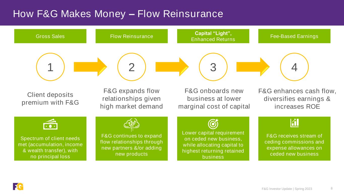 F&G Investor Update | Spring 2023 7 How F&G Makes Money – Retained Sales Client deposits premium with F&G 1 F&G invests in high quality and well diversified portfolio 2 F&G’s yield outpaces cost of funds and expenses 3 F&G’s AAUM growth drives earnings 4 Spectrum of client needs met (accumulation, income & wealth transfer), with no principal loss F&G’s strategic partnership with Blackstone provides a competitive advantage Product margin is difference between portfolio earned yield and cost of funds F&G expects steady and growing earnings over time, excluding short-term mark-to-market effects Gross Sales Assets Under Management Product Margin, Net of Expenses Spread-Based Earnings