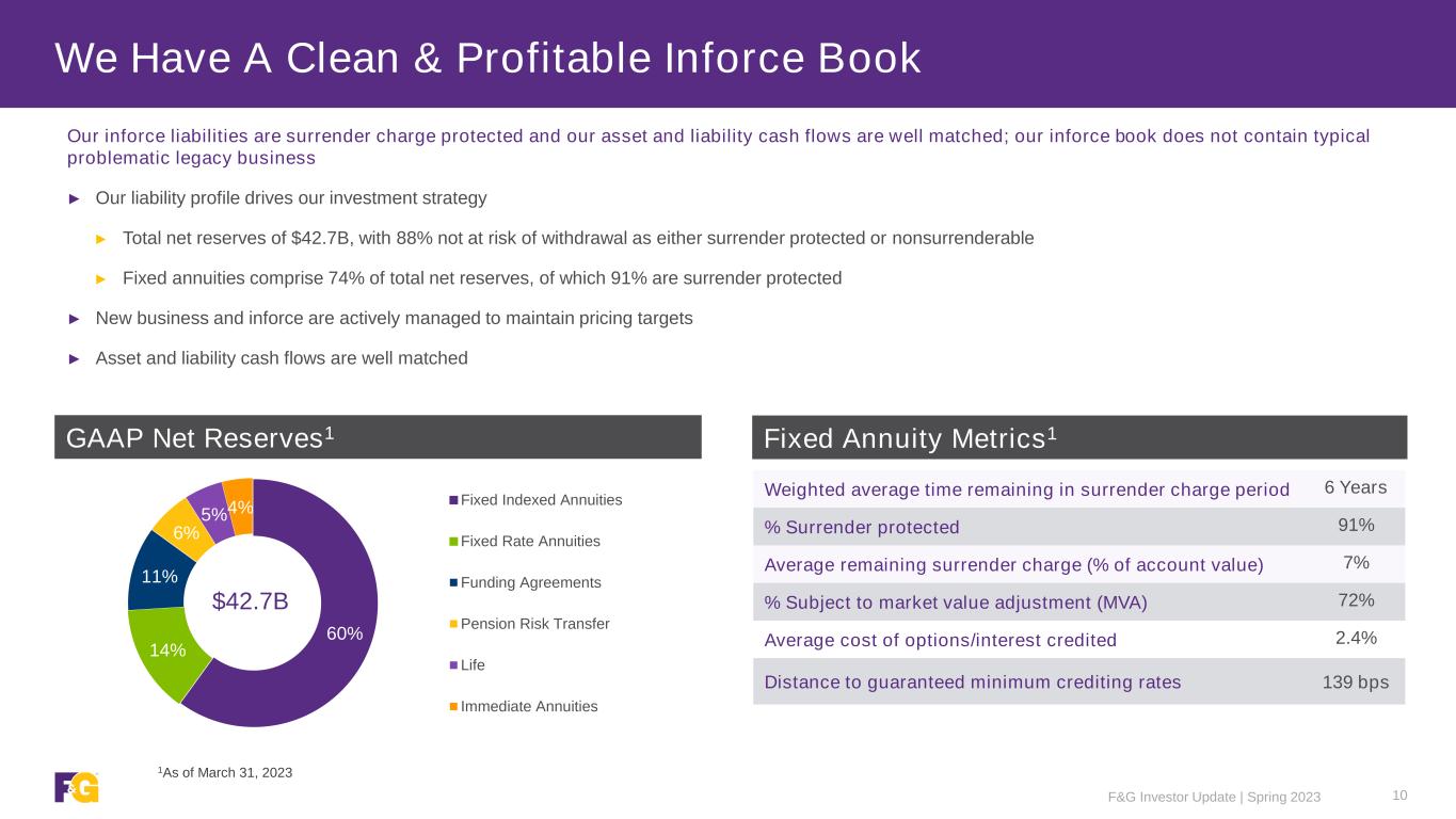 F&G Investor Update | Spring 2023 9 How F&G Makes Money – Owned Distribution F&G takes equity stake in independent agent distribution 1 F&G earns dividend stream on “capital light” distribution 2 F&G generates higher margins at lower marginal cost of capital 3 F&G diversifies earnings through accretive owned distribution 4 F&G’s deep distribution relationships, long-term focus and product expertise provide ‘win win’ F&G receives dividend income stream from ownership stake as share of earnings Partnership grants access to higher margins and preferred shelf space within capital “light” distribution F&G expects at-scale distribution to trade at higher multiple relative to Life & Annuity Investment in Owned Distribution Dividend Income Stream Capital “Light”, Greater Margin Potential Higher Multiple Earnings