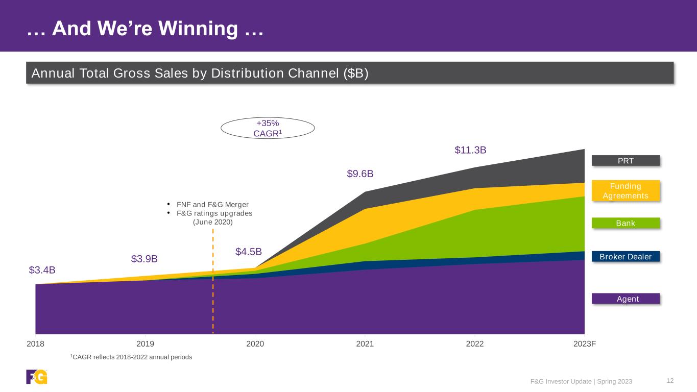 F&G Investor Update | Spring 2023 11 We Are Playing In High Growth Markets … U.S. Consumer Savings1 Certificates of Deposit2 Retail Life & Annuities3 Pension Risk Transfer4 Funding Agreements6 $140B $210B $354B 12021 personal savings in the U.S. per Statista Research Department, May 10, 2022 22018 USD held in CD Accounts <$100K per Federal Reserve Bank of St. Louis 32020 direct written premiums for Individual Life and Individual Annuities per Conning, Inc. $600B 4Value of U.S. pension risk transfer (PRT) assets held with all current PRT writers per LIMRA 2Q22 Pension Risk Transfer Survey 5U.S. Pension Risk Transfer Market Posts Record-Breaking 2021 per Pensions & Investments, Source Legal & General, February 8, 2022 6Outstanding value of Funding Agreement Backed Securities per Conning, Inc., Source: Federal Reserve, June 30, 2021 $2.3T Untapped demand for permanent life insurance, especially in the Middle Market Transaction volume likely to increase5 The U.S. retirement and middle markets are growing and we are both well-established and well-positioned for continued growth in our retail and institutional channels Consumers increasingly rely on personal savings for retirement income Many of these consumers would be better served by fixed annuity products