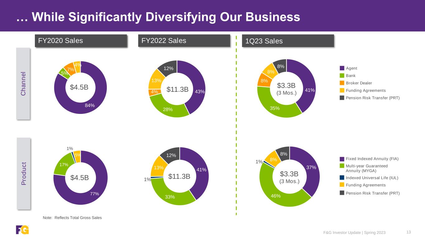2018 2019 2020 2021 2022 2023F F&G Investor Update | Spring 2023 12 Funding Agreements Agent PRT Broker Dealer Bank $9.6B $4.5B $3.9B $3.4B +35% CAGR1 Annual Total Gross Sales by Distribution Channel ($B) • FNF and F&G Merger • F&G ratings upgrades (June 2020) 1CAGR reflects 2018-2022 annual periods … And We’re Winning … $11.3B