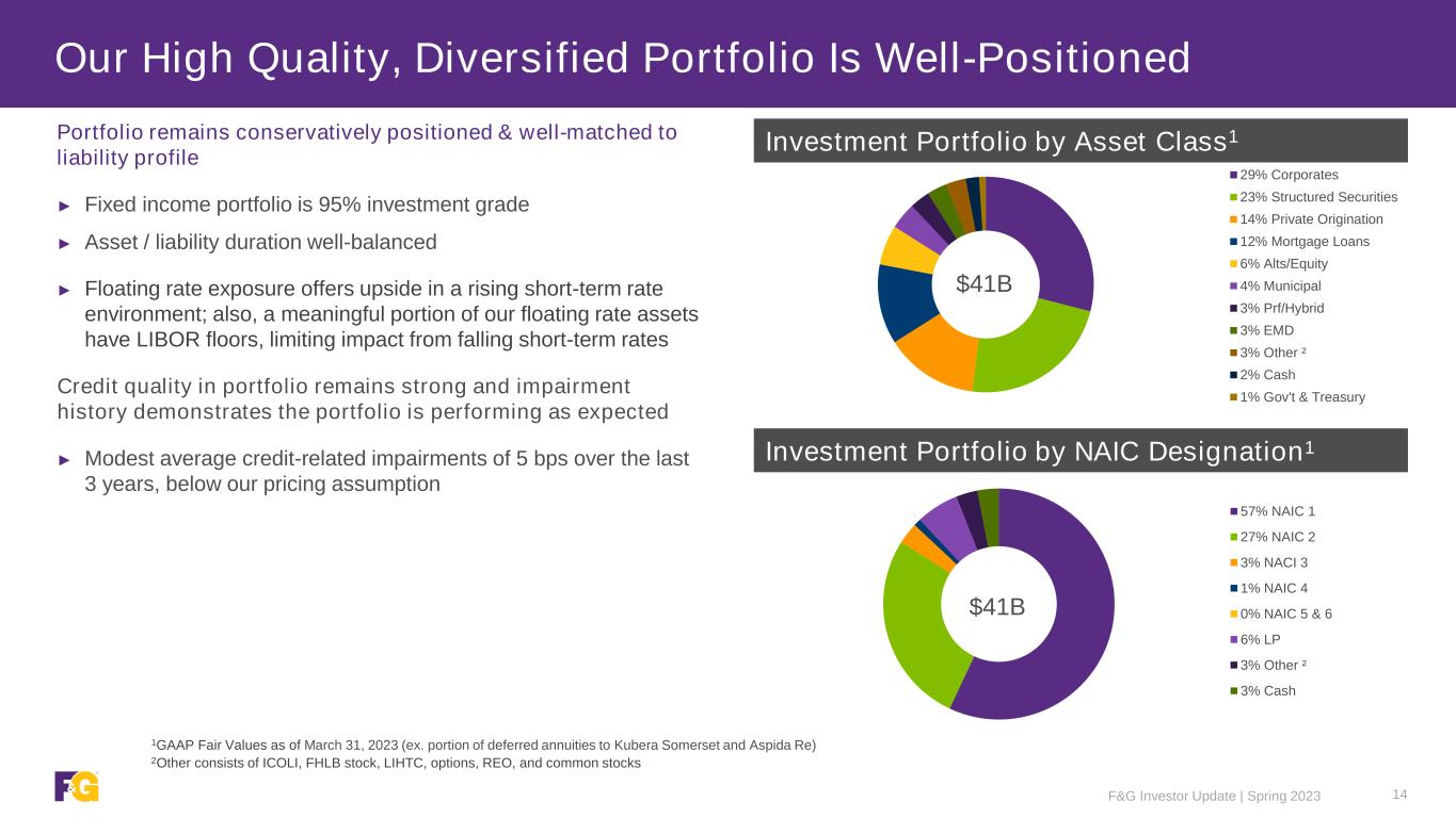 41% 35% 8% 8% 8% $3.3B (3 Mos.) 13 … While Significantly Diversifying Our Business Note: Reflects Total Gross Sales FY2022 SalesFY2020 Sales 1Q23 Sales Bank Broker Dealer Agent Funding Agreements Pension Risk Transfer (PRT) C h a n n e l P ro d u c t 37% 46% 1% 8% 8% $3.3B (3 Mos.) Multi-year Guaranteed Annuity (MYGA) Indexed Universal Life (IUL) Funding Agreements Fixed Indexed Annuity (FIA) Pension Risk Transfer (PRT) F&G Investor Update | Spring 2023 43% 28% 4% 13% 12% $11.3B 41% 33% 1% 13% 12% $11.3B 77% 17% 1% 5% $4.5B 84% 5% 7% 4% $4.5B