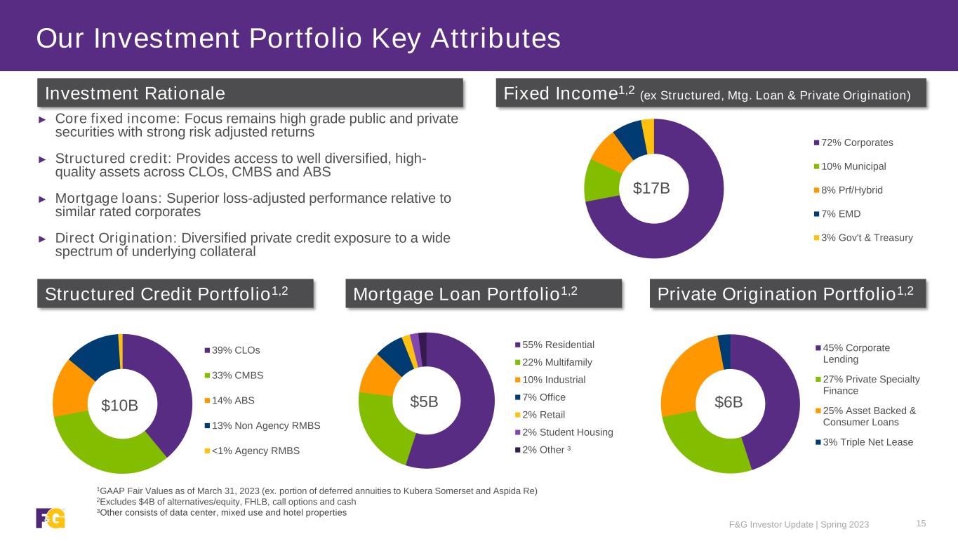 57% NAIC 1 27% NAIC 2 3% NACI 3 1% NAIC 4 0% NAIC 5 & 6 6% LP 3% Other ² 3% Cash 29% Corporates 23% Structured Securities 14% Private Origination 12% Mortgage Loans 6% Alts/Equity 4% Municipal 3% Prf/Hybrid 3% EMD 3% Other ² 2% Cash 1% Gov't & Treasury Our High Quality, Diversified Portfolio Is Well-Positioned 14 Portfolio remains conservatively positioned & well-matched to liability profile ► Fixed income portfolio is 95% investment grade ► Asset / liability duration well-balanced ► Floating rate exposure offers upside in a rising short-term rate environment; also, a meaningful portion of our floating rate assets have LIBOR floors, limiting impact from falling short-term rates Credit quality in portfolio remains strong and impairment history demonstrates the portfolio is performing as expected ► Modest average credit-related impairments of 5 bps over the last 3 years, below our pricing assumption Investment Portfolio by NAIC Designation1 1GAAP Fair Values as of March 31, 2023 (ex. portion of deferred annuities to Kubera Somerset and Aspida Re) 2Other consists of ICOLI, FHLB stock, LIHTC, options, REO, and common stocks Investment Portfolio by Asset Class1 $41B $41B F&G Investor Update | Spring 2023