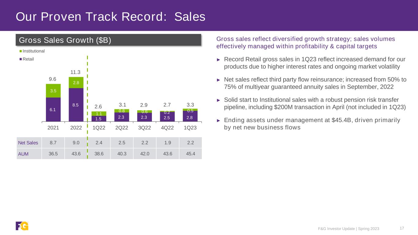31.9 40.1 37.5 44.4 2021 2022 1Q22 1Q23 F&G Investor Update | Spring 2023 16 F&G’s Track Record of Disciplined & Profitable Growth Total Gross Sales ($B) Average Assets Under Management (AAUM) ($B) Ending AUM 36.5 43.6 38.6 45.4 Return on Assets (ROA) – (YTD in bps) 205 82 85 44 Adjusted Net Earnings 656 328 80 49 Alts Short-term MTM (Actual) – ($M) 497 202 102 99 Alts Long-term Return (Expected) – ($M) 236 419 100 132 All Other Significant Income & Expense Items 83 99 (20) (37) Adjusted Net Earnings ($M) Net Sales 8.7 9.0 2.4 2.2 6.1 8.5 1.5 2.8 3.5 2.8 1.1 0.5 9.6 11.3 2.6 3.3 2021 2022 1Q22 1Q23 Institutional Retail +27% VPY +18% VPY 18% VPY 26% VPY 656 328 80 49 2021 2022 1Q22 1Q23 Significant Income & Expense Items ANE ex Significant Items