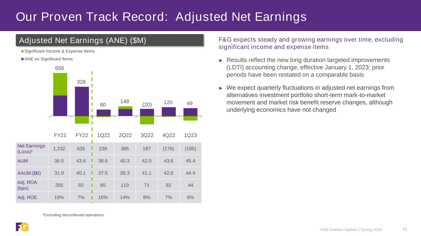 6.1 8.5 1.5 2.3 2.3 2.5 2.8 3.5 2.8 1.1 0.8 0.6 0.2 0.5 9.6 11.3 2.6 3.1 2.9 2.7 3.3 2021 2022 1Q22 2Q22 3Q22 4Q22 1Q23 Institutional Retail F&G Investor Update | Spring 2023 17 Our Proven Track Record: Sales Gross Sales Growth ($B) Net Sales 8.7 9.0 2.4 2.5 2.2 1.9 2.2 AUM 36.5 43.6 38.6 40.3 42.0 43.6 45.4 Gross sales reflect diversified growth strategy; sales volumes effectively managed within profitability & capital targets ► Record Retail gross sales in 1Q23 reflect increased demand for our products due to higher interest rates and ongoing market volatility ► Net sales reflect third party flow reinsurance; increased from 50% to 75% of multiyear guaranteed annuity sales in September, 2022 ► Solid start to Institutional sales with a robust pension risk transfer pipeline, including $200M transaction in April (not included in 1Q23) ► Ending assets under management at $45.4B, driven primarily by net new business flows