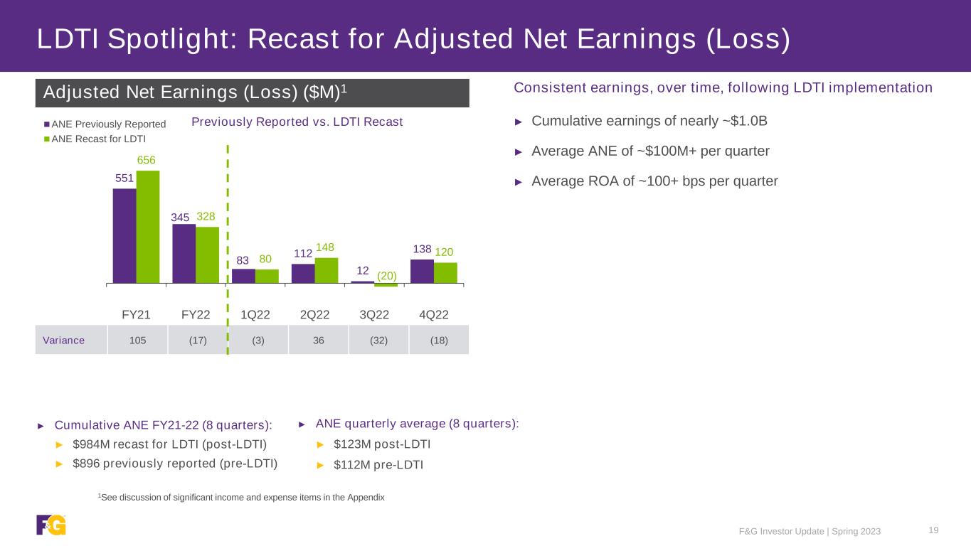656 328 80 148 (20) 120 49 FY21 FY22 1Q22 2Q22 3Q22 4Q22 1Q23 Significant Income & Expense Items ANE ex Significant Items F&G Investor Update | Spring 2023 18 Our Proven Track Record: Adjusted Net Earnings 1Excluding discontinued operations Adjusted Net Earnings (ANE) ($M) Net Earnings (Loss)1 1,232 635 239 385 187 (176) (195) AUM 36.5 43.6 38.6 40.3 42.0 43.6 45.4 AAUM ($B) 31.9 40.1 37.5 39.3 41.1 42.6 44.4 Adj. ROA (bps) 205 82 85 119 71 82 44 Adj. ROE 18% 7% 16% 14% 8% 7% 6% F&G expects steady and growing earnings over time, excluding significant income and expense items ► Results reflect the new long duration targeted improvements (LDTI) accounting change, effective January 1, 2023; prior periods have been restated on a comparable basis ► We expect quarterly fluctuations in adjusted net earnings from alternatives investment portfolio short-term mark-to-market movement and market risk benefit reserve changes, although underlying economics have not changed