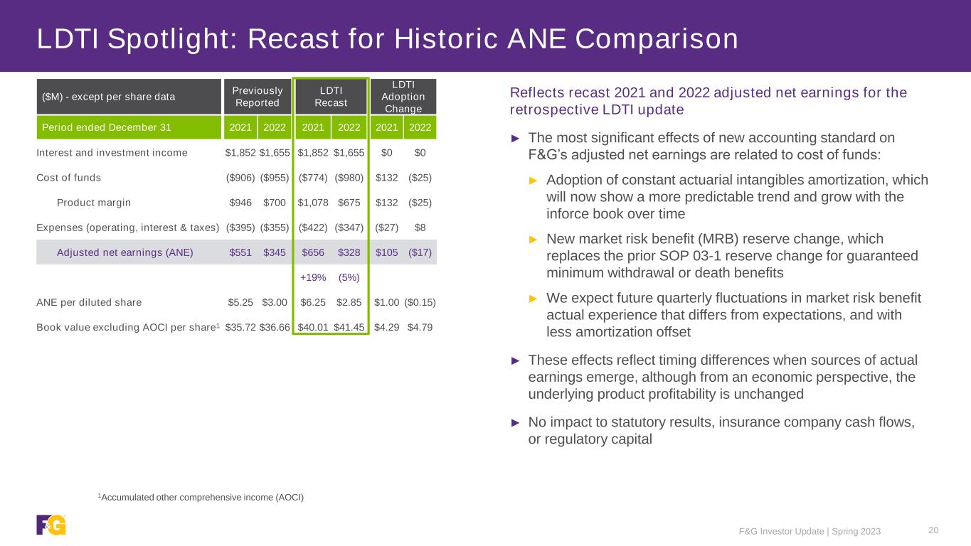 551 345 83 112 12 138 656 328 80 148 (20) 120 FY21 FY22 1Q22 2Q22 3Q22 4Q22 ANE Previously Reported ANE Recast for LDTI Adjusted Net Earnings (Loss) ($M)1 LDTI Spotlight: Recast for Adjusted Net Earnings (Loss) F&G Investor Update | Spring 2023 19 1See discussion of significant income and expense items in the Appendix Previously Reported vs. LDTI Recast Variance 105 (17) (3) 36 (32) (18) ► ANE quarterly average (8 quarters): ► $123M post-LDTI ► $112M pre-LDTI ► Cumulative ANE FY21-22 (8 quarters): ► $984M recast for LDTI (post-LDTI) ► $896 previously reported (pre-LDTI) Consistent earnings, over time, following LDTI implementation ► Cumulative earnings of nearly ~$1.0B ► Average ANE of ~$100M+ per quarter ► Average ROA of ~100+ bps per quarter