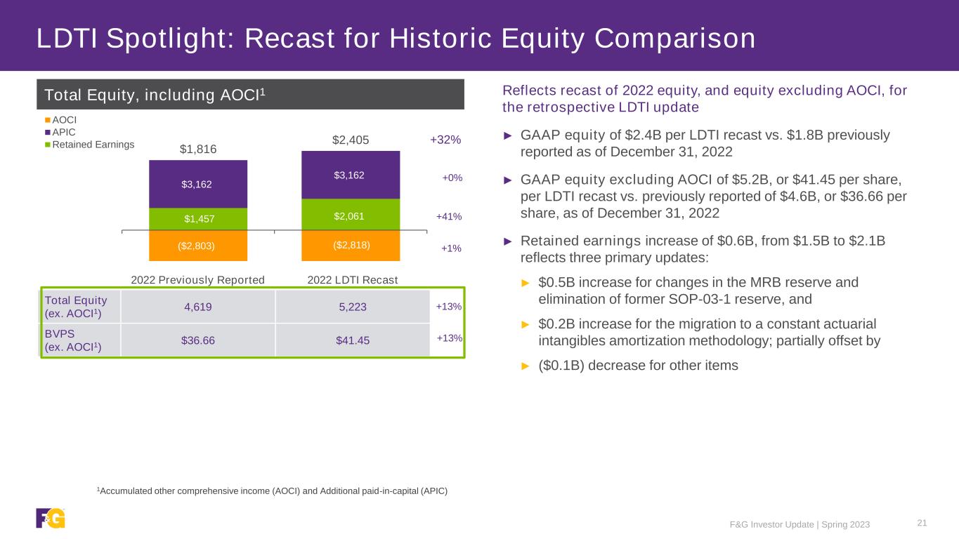 F&G Investor Update | Spring 2023 20 LDTI Spotlight: Recast for Historic ANE Comparison 1Accumulated other comprehensive income (AOCI) ($M) - except per share data Previously Reported LDTI Recast LDTI Adoption Change Period ended December 31 2021 2022 2021 2022 2021 2022 Interest and investment income $1,852 $1,655 $1,852 $1,655 $0 $0 Cost of funds ($906) ($955) ($774) ($980) $132 ($25) Product margin $946 $700 $1,078 $675 $132 ($25) Expenses (operating, interest & taxes) ($395) ($355) ($422) ($347) ($27) $8 Adjusted net earnings (ANE) $551 $345 $656 $328 $105 ($17) +19% (5%) ANE per diluted share $5.25 $3.00 $6.25 $2.85 $1.00 ($0.15) Book value excluding AOCI per share1 $35.72 $36.66 $40.01 $41.45 $4.29 $4.79 Reflects recast 2021 and 2022 adjusted net earnings for the retrospective LDTI update ► The most significant effects of new accounting standard on F&G’s adjusted net earnings are related to cost of funds: ► Adoption of constant actuarial intangibles amortization, which will now show a more predictable trend and grow with the inforce book over time ► New market risk benefit (MRB) reserve change, which replaces the prior SOP 03-1 reserve change for guaranteed minimum withdrawal or death benefits ► We expect future quarterly fluctuations in market risk benefit actual experience that differs from expectations, and with less amortization offset ► These effects reflect timing differences when sources of actual earnings emerge, although from an economic perspective, the underlying product profitability is unchanged ► No impact to statutory results, insurance company cash flows, or regulatory capital