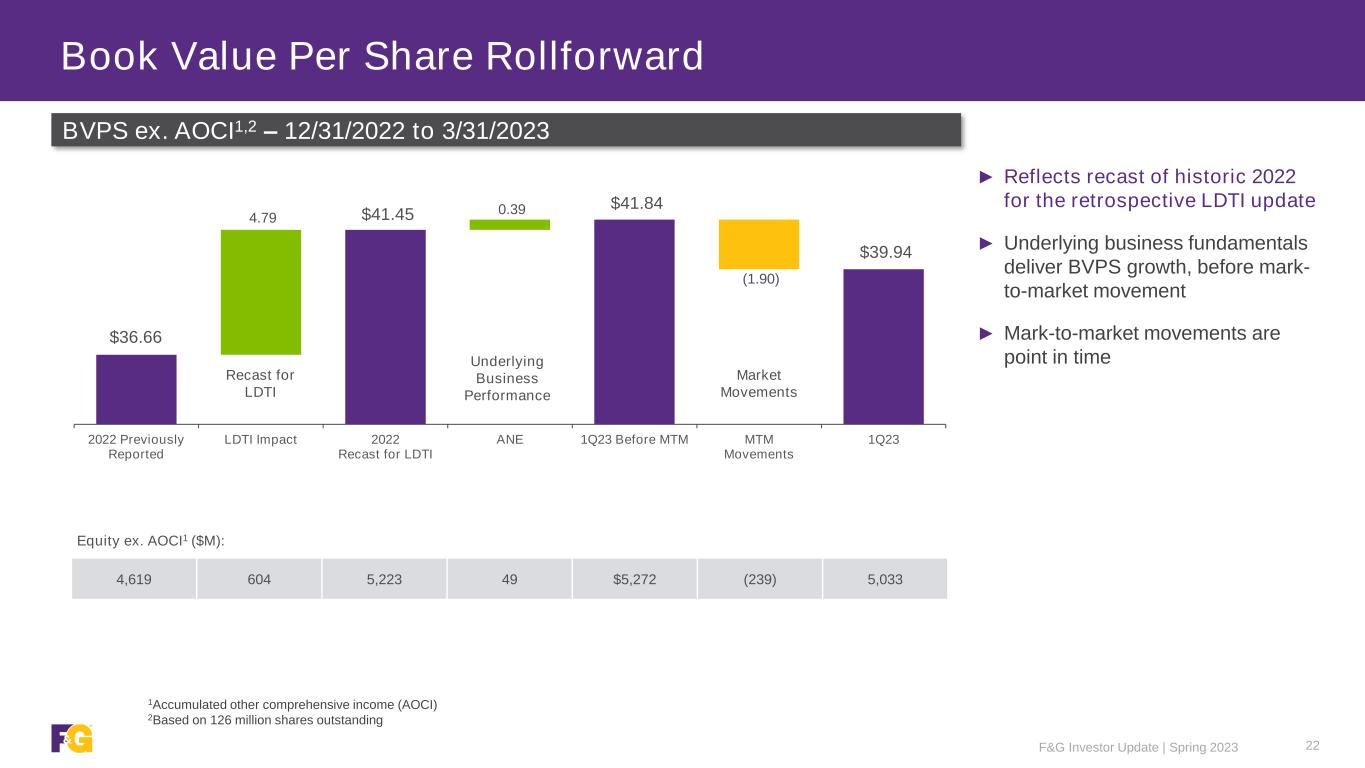 $1,457 $2,061 $3,162 $3,162 ($2,803) ($2,818) $1,816 $2,405 AOCI APIC Retained Earnings LDTI Spotlight: Recast for Historic Equity Comparison F&G Investor Update | Spring 2023 Total Equity, including AOCI1 1Accumulated other comprehensive income (AOCI) and Additional paid-in-capital (APIC) 21 2022 Previously Reported 2022 LDTI Recast Total Equity (ex. AOCI1) 4,619 5,223 BVPS (ex. AOCI1) $36.66 $41.45 +32% +41% +1% +13% +13% Reflects recast of 2022 equity, and equity excluding AOCI, for the retrospective LDTI update ► GAAP equity of $2.4B per LDTI recast vs. $1.8B previously reported as of December 31, 2022 ► GAAP equity excluding AOCI of $5.2B, or $41.45 per share, per LDTI recast vs. previously reported of $4.6B, or $36.66 per share, as of December 31, 2022 ► Retained earnings increase of $0.6B, from $1.5B to $2.1B reflects three primary updates: ► $0.5B increase for changes in the MRB reserve and elimination of former SOP-03-1 reserve, and ► $0.2B increase for the migration to a constant actuarial intangibles amortization methodology; partially offset by ► ($0.1B) decrease for other items +0%