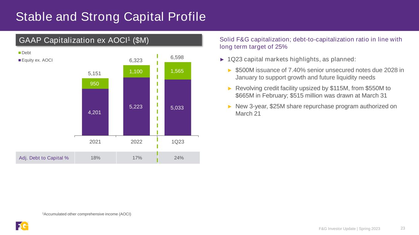 F&G Investor Update | Spring 2023 1 $36.66 $41.45 $41.84 $39.94 4.79 0.39 (1.90) 2022 Previously Reported LDTI Impact 2022 Recast for LDTI ANE 1Q23 Before MTM MTM Movements 1Q23 ► Reflects recast of historic 2022 for the retrospective LDTI update ► Underlying business fundamentals deliver BVPS growth, before mark- to-market movement ► Mark-to-market movements are point in time Book Value Per Share Rollforward BVPS ex. AOCI1,2 – 12/31/2022 to 3/31/2023 1Accumulated other comprehensive income (AOCI) 2Based on 126 million shares outstanding 22 4,619 604 5,223 49 $5,272 (239) 5,033 Equity ex. AOCI1 ($M): Market Movements Recast for LDTI Underlying Business Performance