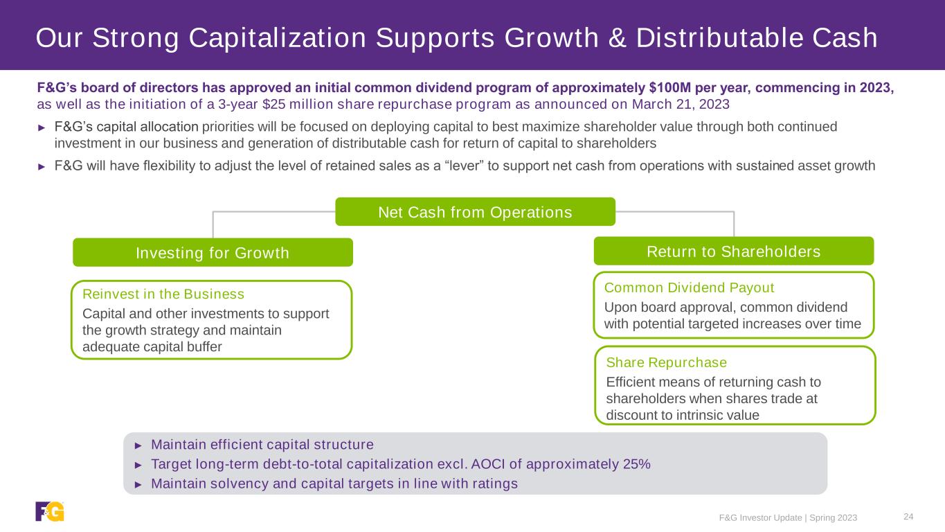 F&G Investor Update | Spring 2023 24 Our Strong Capitalization Supports Growth & Distributable Cash F&G’s board of directors has approved an initial common dividend program of approximately $100M per year, commencing in 2023, as well as the initiation of a 3-year $25 million share repurchase program as announced on March 21, 2023 ► F&G’s capital allocation priorities will be focused on deploying capital to best maximize shareholder value through both continued investment in our business and generation of distributable cash for return of capital to shareholders ► F&G will have flexibility to adjust the level of retained sales as a “lever” to support net cash from operations with sustained asset growth Investing for Growth Reinvest in the Business Capital and other investments to support the growth strategy and maintain adequate capital buffer Net Cash from Operations Return to Shareholders Common Dividend Payout Upon board approval, common dividend with potential targeted increases over time ► Maintain efficient capital structure ► Target long-term debt-to-total capitalization excl. AOCI of approximately 25% ► Maintain solvency and capital targets in line with ratings Share Repurchase Efficient means of returning cash to shareholders when shares trade at discount to intrinsic value