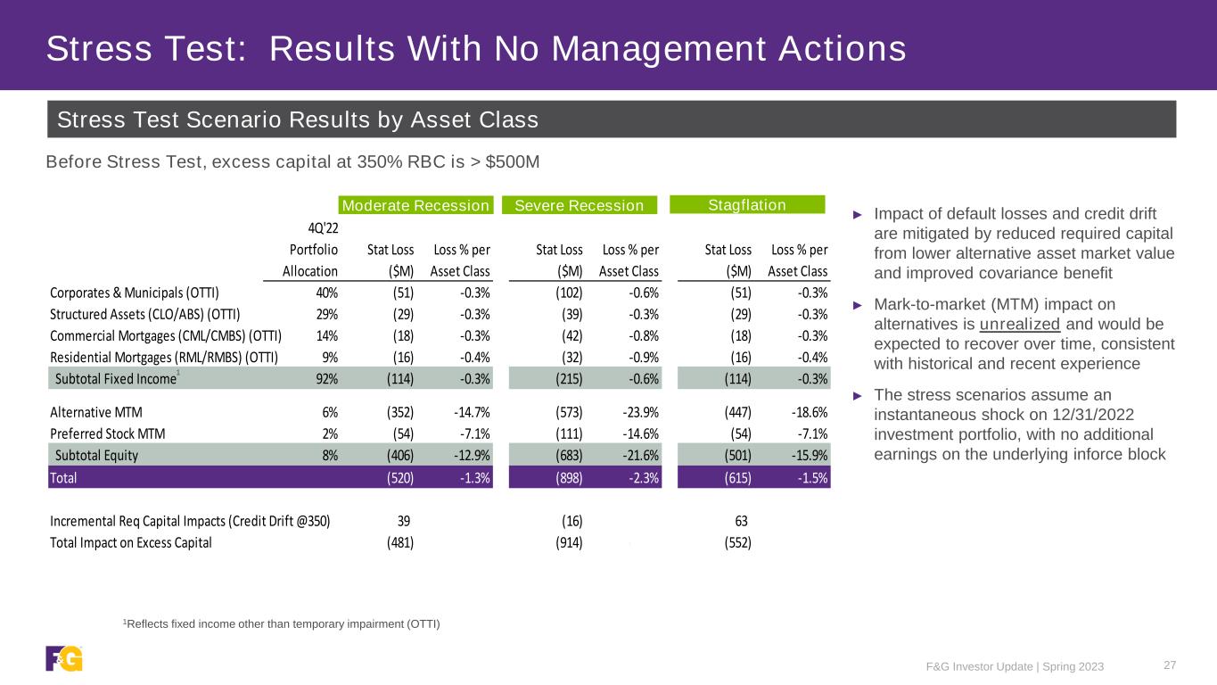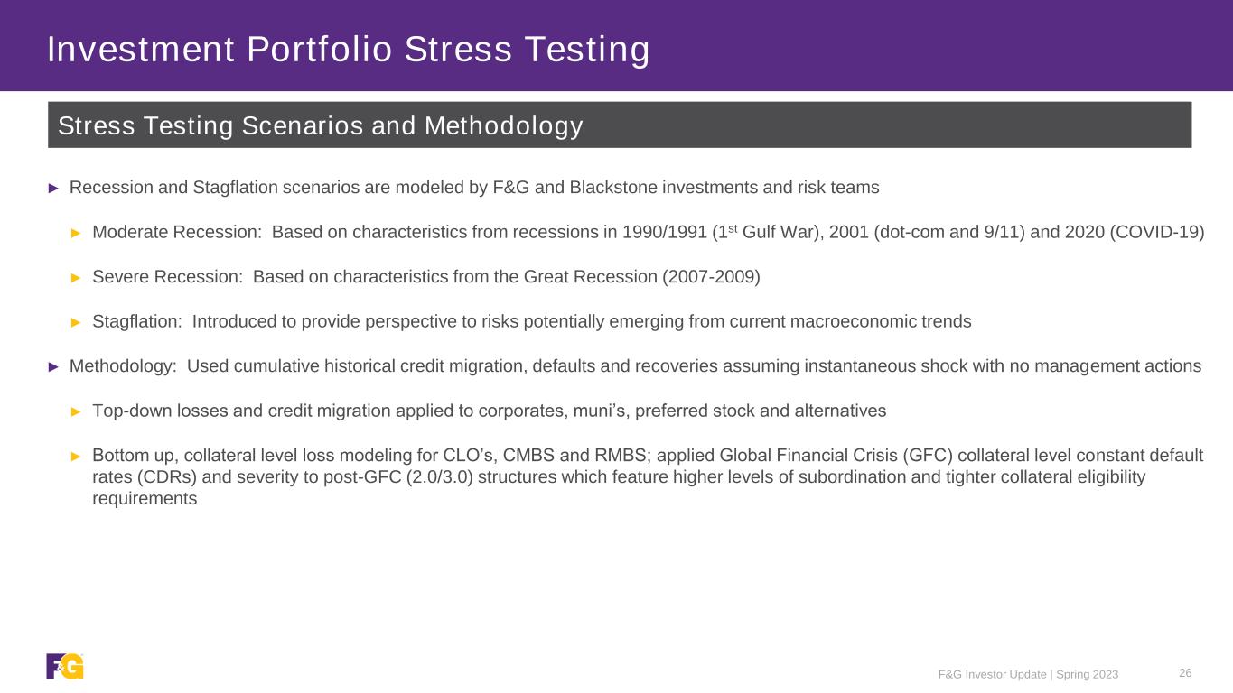 Stress Testing Scenarios and Methodology Investment Portfolio Stress Testing F&G Investor Update | Spring 2023 26 ► Recession and Stagflation scenarios are modeled by F&G and Blackstone investments and risk teams ► Moderate Recession: Based on characteristics from recessions in 1990/1991 (1st Gulf War), 2001 (dot-com and 9/11) and 2020 (COVID-19) ► Severe Recession: Based on characteristics from the Great Recession (2007-2009) ► Stagflation: Introduced to provide perspective to risks potentially emerging from current macroeconomic trends ► Methodology: Used cumulative historical credit migration, defaults and recoveries assuming instantaneous shock with no management actions ► Top-down losses and credit migration applied to corporates, muni’s, preferred stock and alternatives ► Bottom up, collateral level loss modeling for CLO’s, CMBS and RMBS; applied Global Financial Crisis (GFC) collateral level constant default rates (CDRs) and severity to post-GFC (2.0/3.0) structures which feature higher levels of subordination and tighter collateral eligibility requirements