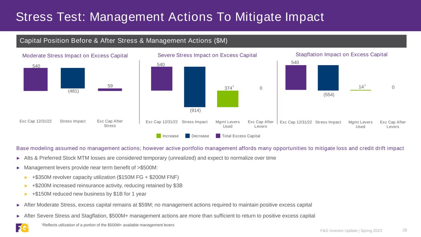 Stress Test Scenario Results by Asset Class F&G Investor Update | Spring 2023 27 Stress Test: Results With No Management Actions ► Impact of default losses and credit drift are mitigated by reduced required capital from lower alternative asset market value and improved covariance benefit ► Mark-to-market (MTM) impact on alternatives is unrealized and would be expected to recover over time, consistent with historical and recent experience ► The stress scenarios assume an instantaneous shock on 12/31/2022 investment portfolio, with no additional earnings on the underlying inforce block Excess Capital at 350 RBC is over $500m for FGLIC Retained Stat Loss ($M) Loss % per Asset Class Stat Loss ($M) Loss % per Asset Class Stat Loss ($M) Loss % per Asset Class Corporates & Municipals (OTTI) 40% (51) -0.3% (102) -0.6% (51) -0.3% Structured Assets (CLO/ABS) (OTTI) 29% (29) -0.3% (39) -0.3% (29) -0.3% Commercial Mortgages (CML/CMBS) (OTTI) 14% (18) -0.3% (42) -0.8% (18) -0.3% Residential Mortgages (RML/RMBS) (OTTI) 9% (16) -0.4% (32) -0.9% (16) -0.4% Subtotal Fixed Income 92% (114) -0.3% (215) -0.6% (114) -0.3% Alternative MTM 6% (352) -14.7% (573) -23.9% (447) -18.6% Preferred Stock MTM 2% (54) -7.1% (111) -14.6% (54) -7.1% Subtotal Equity 8% (406) -12.9% (683) -21.6% (501) -15.9% Total (520) -1.3% (898) -2.3% (615) -1.5% Incremental Req Capital Impacts (Credit Drift @350) 39 0.1% (16) 0.0% 63 0.2% Total Impact on Excess Capital (481) -1.2% (914) -2.3% (552) -1.4% Recession Scenario Deep Recession Scenario Stagflation Scenario 4Q'22 Portfolio Allocation Moderate Recession Severe Recession Stagflation Before Stress Test, excess capital at 350% RBC is > $500M 1Reflects fixed income other than temporary impairment (OTTI) 1