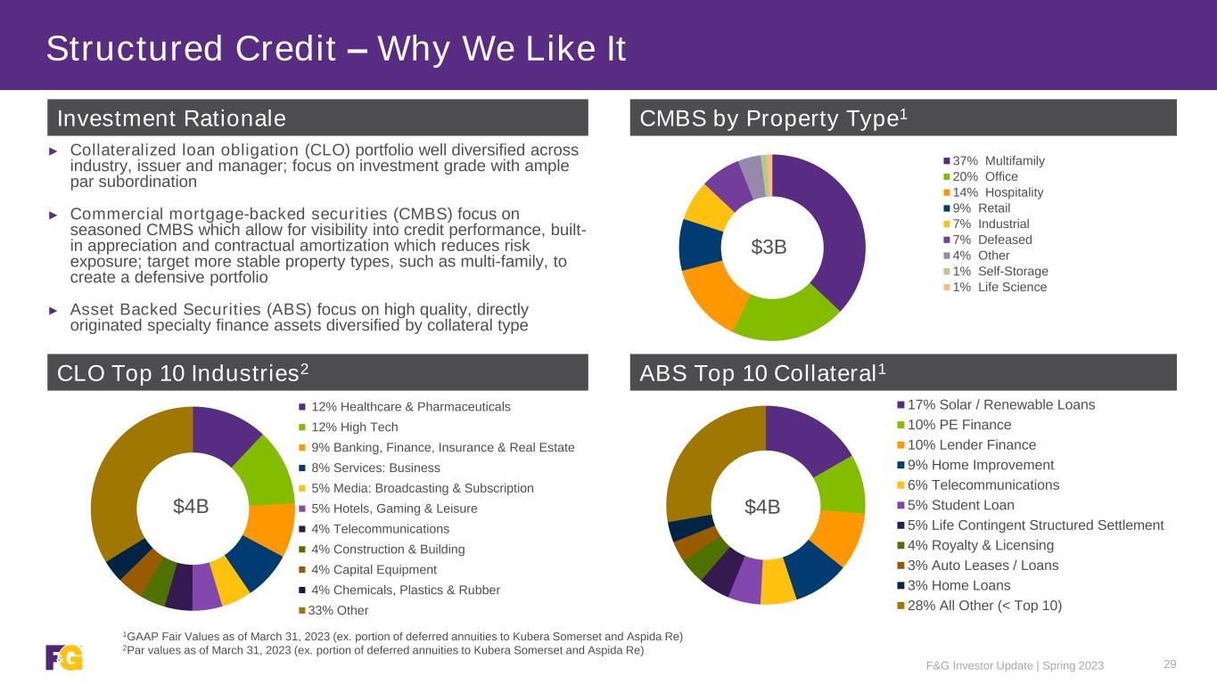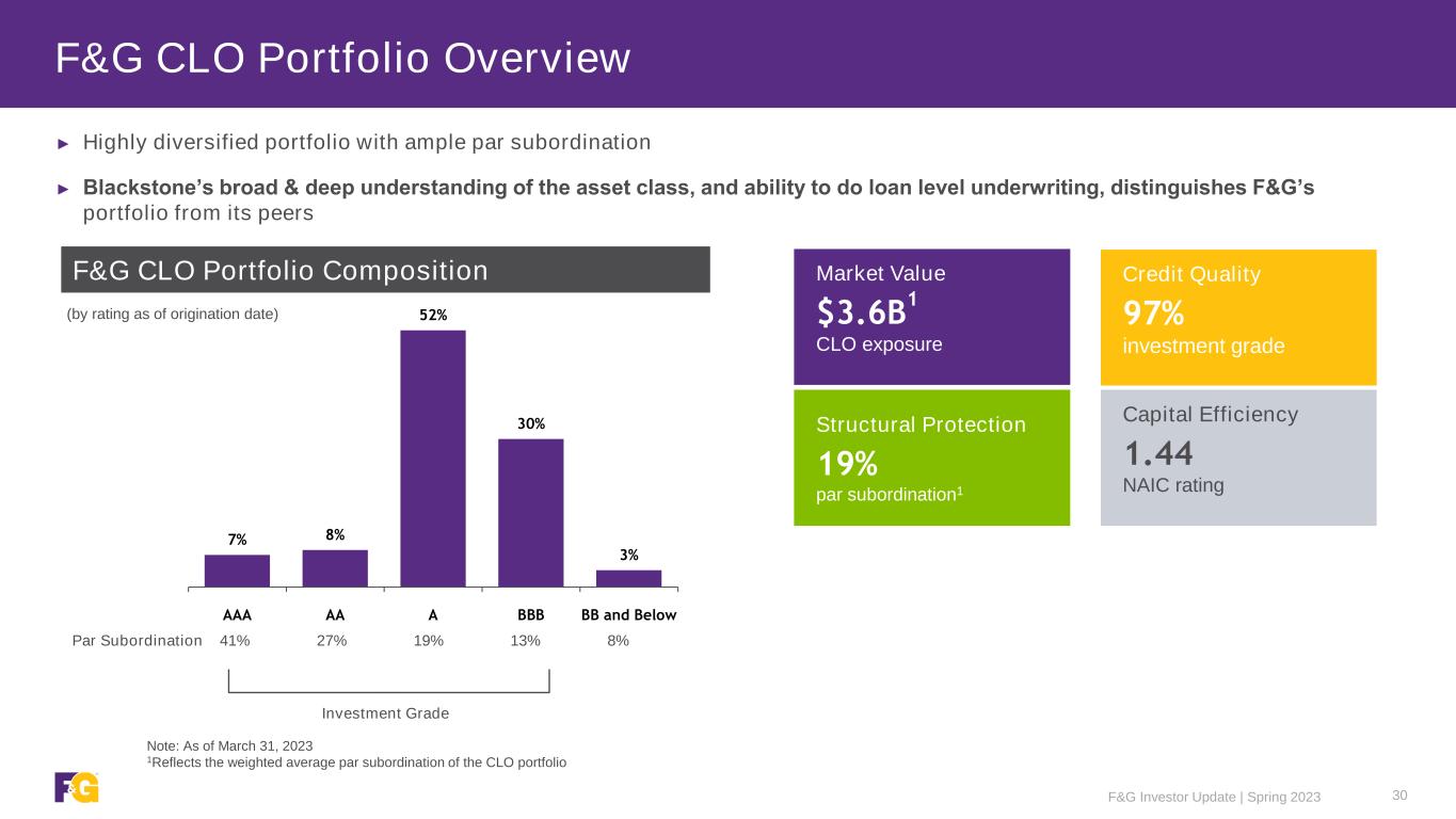 Structured Credit – Why We Like It F&G Investor Update | Spring 2023 29 CLO Top 10 Industries2 ► Collateralized loan obligation (CLO) portfolio well diversified across industry, issuer and manager; focus on investment grade with ample par subordination ► Commercial mortgage-backed securities (CMBS) focus on seasoned CMBS which allow for visibility into credit performance, built- in appreciation and contractual amortization which reduces risk exposure; target more stable property types, such as multi-family, to create a defensive portfolio ► Asset Backed Securities (ABS) focus on high quality, directly originated specialty finance assets diversified by collateral type Investment Rationale CMBS by Property Type1 1GAAP Fair Values as of March 31, 2023 (ex. portion of deferred annuities to Kubera Somerset and Aspida Re) 2Par values as of March 31, 2023 (ex. portion of deferred annuities to Kubera Somerset and Aspida Re) 12% Healthcare & Pharmaceuticals 12% High Tech 9% Banking, Finance, Insurance & Real Estate 8% Services: Business 5% Media: Broadcasting & Subscription 5% Hotels, Gaming & Leisure 4% Telecommunications 4% Construction & Building 4% Capital Equipment 4% Chemicals, Plastics & Rubber 33% Other $4B 37% Multifamily 20% Office 14% Hospitality 9% Retail 7% Industrial 7% Defeased 4% Other 1% Self-Storage 1% Life Science $3B ABS Top 10 Collateral1 17% Solar / Renewable Loans 10% PE Finance 10% Lender Finance 9% Home Improvement 6% Telecommunications 5% Student Loan 5% Life Contingent Structured Settlement 4% Royalty & Licensing 3% Auto Leases / Loans 3% Home Loans 28% All Other (< Top 10) $4B
