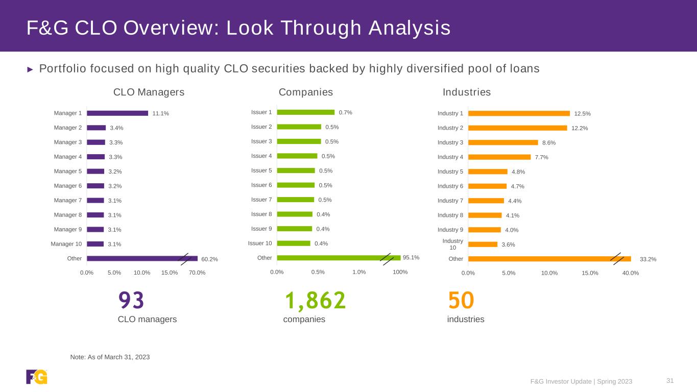 F&G Investor Update | Spring 2023 F&G CLO Overview: Look Through Analysis ► Portfolio focused on high quality CLO securities backed by highly diversified pool of loans Note: As of March 31, 2023 IndustriesCompaniesCLO Managers 31 93 CLO managers 1,862 companies 50 industries 11.1% 3.4% 3.3% 3.3% 3.2% 3.2% 3.1% 3.1% 3.1% 3.1% 0.0% 5.0% 10.0% 15.0% 70.0% Manager 1 Manager 2 Manager 3 Manager 4 Manager 5 Manager 6 Manager 7 Manager 8 Manager 9 Manager 10 Other 60.2% 0.7% 0.5% 0.5% 0.5% 0.5% 0.5% 0.5% 0.4% 0.4% 0.4% 0.0% 0.5% 1.0% 100% Issuer 1 Issuer 2 Issuer 3 Issuer 4 Issuer 5 Issuer 6 Issuer 7 Issuer 8 Issuer 9 Issuer 10 Other 95.1% 12.5% 12.2% 8.6% 7.7% 4.8% 4.7% 4.4% 4.1% 4.0% 3.6% 0.0% 5.0% 10.0% 15.0% 40.0% Industry 1 Industry 2 Industry 3 Industry 4 Industry 5 Industry 6 Industry 7 Industry 8 Industry 9 Industry 10 Other 33.2%