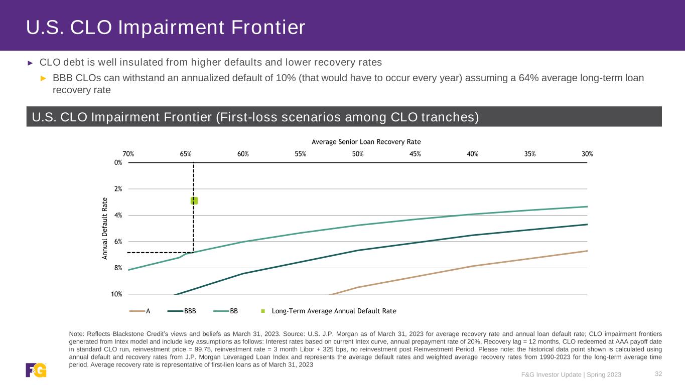 U.S. CLO Impairment Frontier (First-loss scenarios among CLO tranches) U.S. CLO Impairment Frontier F&G Investor Update | Spring 2023 ► CLO debt is well insulated from higher defaults and lower recovery rates ► BBB CLOs can withstand an annualized default of 10% (that would have to occur every year) assuming a 64% average long-term loan recovery rate Note: Reflects Blackstone Credit’s views and beliefs as March 31, 2023. Source: U.S. J.P. Morgan as of March 31, 2023 for average recovery rate and annual loan default rate; CLO impairment frontiers generated from Intex model and include key assumptions as follows: Interest rates based on current Intex curve, annual prepayment rate of 20%, Recovery lag = 12 months, CLO redeemed at AAA payoff date in standard CLO run, reinvestment price = 99.75, reinvestment rate = 3 month Libor + 325 bps, no reinvestment post Reinvestment Period. Please note: the historical data point shown is calculated using annual default and recovery rates from J.P. Morgan Leveraged Loan Index and represents the average default rates and weighted average recovery rates from 1990-2023 for the long-term average time period. Average recovery rate is representative of first-lien loans as of March 31, 2023 32 0% 2% 4% 6% 8% 10% 30%35%40%45%50%55%60%65%70% A n n u a l D e fa u lt R a te Average Senior Loan Recovery Rate A BBB BB Long-Term Average Annual Default Rate