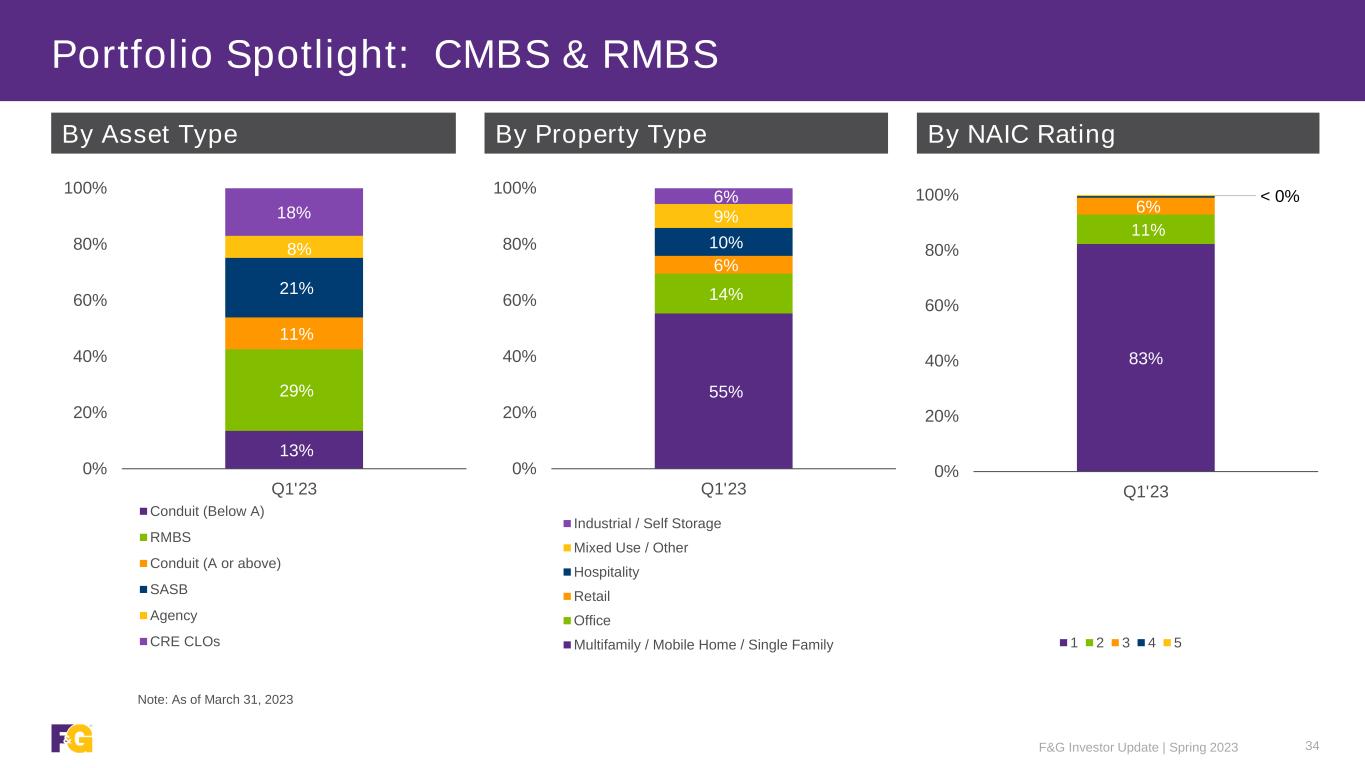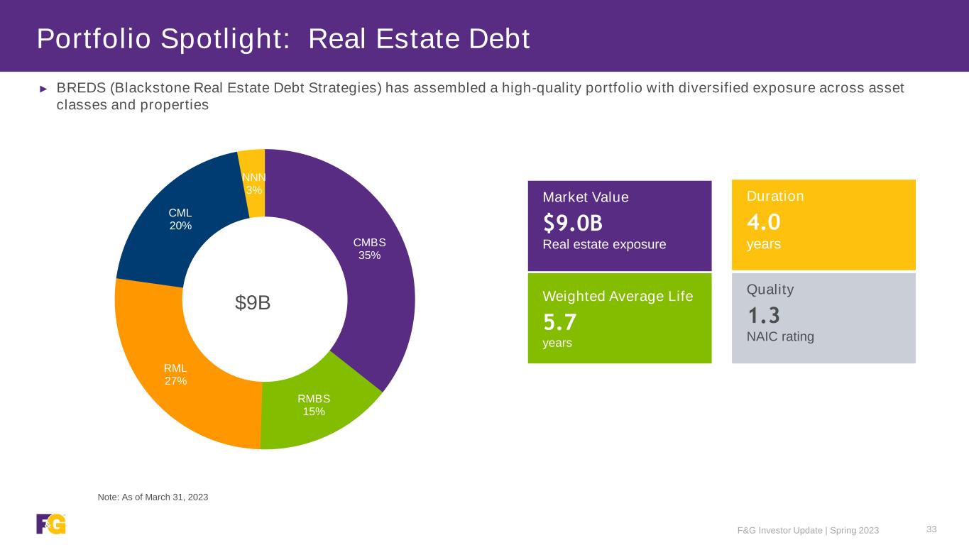 F&G Investor Update | Spring 2023 33 Portfolio Spotlight: Real Estate Debt ► BREDS (Blackstone Real Estate Debt Strategies) has assembled a high-quality portfolio with diversified exposure across asset classes and properties Note: As of March 31, 2023 CMBS 35% RMBS 15% RML 27% CML 20% NNN 3% $9B Duration 4.0 years Weighted Average Life 5.7 years Quality 1.3 NAIC rating Market Value $9.0B Real estate exposure