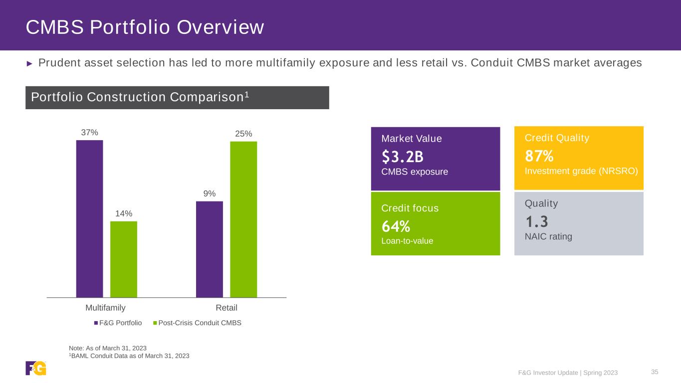 By Asset Type By NAIC RatingBy Property Type Portfolio Spotlight: CMBS & RMBS F&G Investor Update | Spring 2023 Note: As of March 31, 2023 34 13% 29% 11% 21% 8% 18% 0% 20% 40% 60% 80% 100% Q1'23 Conduit (Below A) RMBS Conduit (A or above) SASB Agency CRE CLOs 55% 14% 6% 10% 9% 6% 0% 20% 40% 60% 80% 100% Q1'23 Industrial / Self Storage Mixed Use / Other Hospitality Retail Office Multifamily / Mobile Home / Single Family 83% 11% 6% < 0% 0% 20% 40% 60% 80% 100% Q1'23 1 2 3 4 5