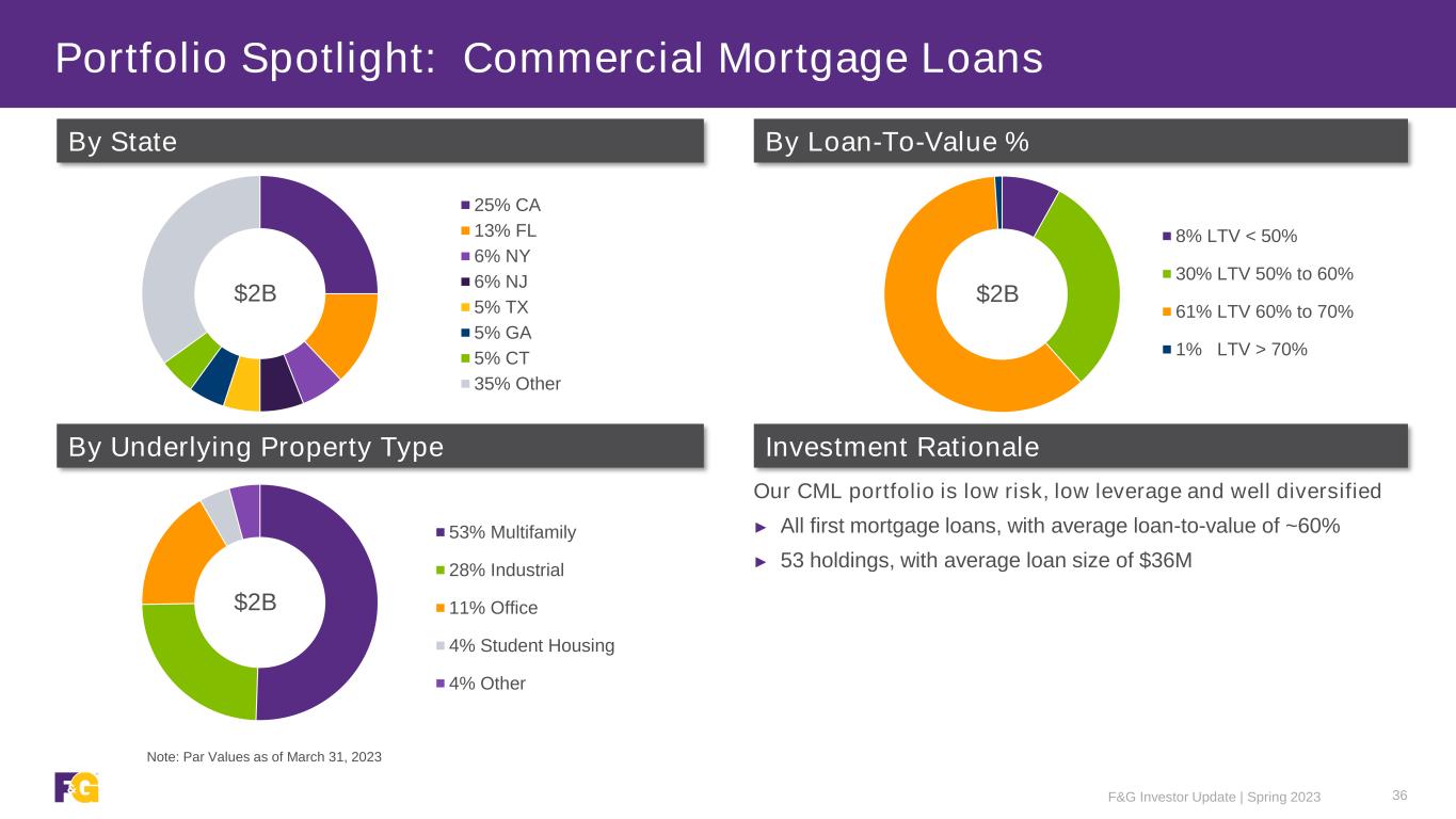 ► Prudent asset selection has led to more multifamily exposure and less retail vs. Conduit CMBS market averages Portfolio Construction Comparison1 CMBS Portfolio Overview F&G Investor Update | Spring 2023 Note: As of March 31, 2023 1BAML Conduit Data as of March 31, 2023 Credit Quality 87% Investment grade (NRSRO) Quality 1.3 NAIC rating Market Value $3.2B CMBS exposure Credit focus 64% Loan-to-value 37% 9% 14% 25% Multifamily Retail F&G Portfolio Post-Crisis Conduit CMBS 35