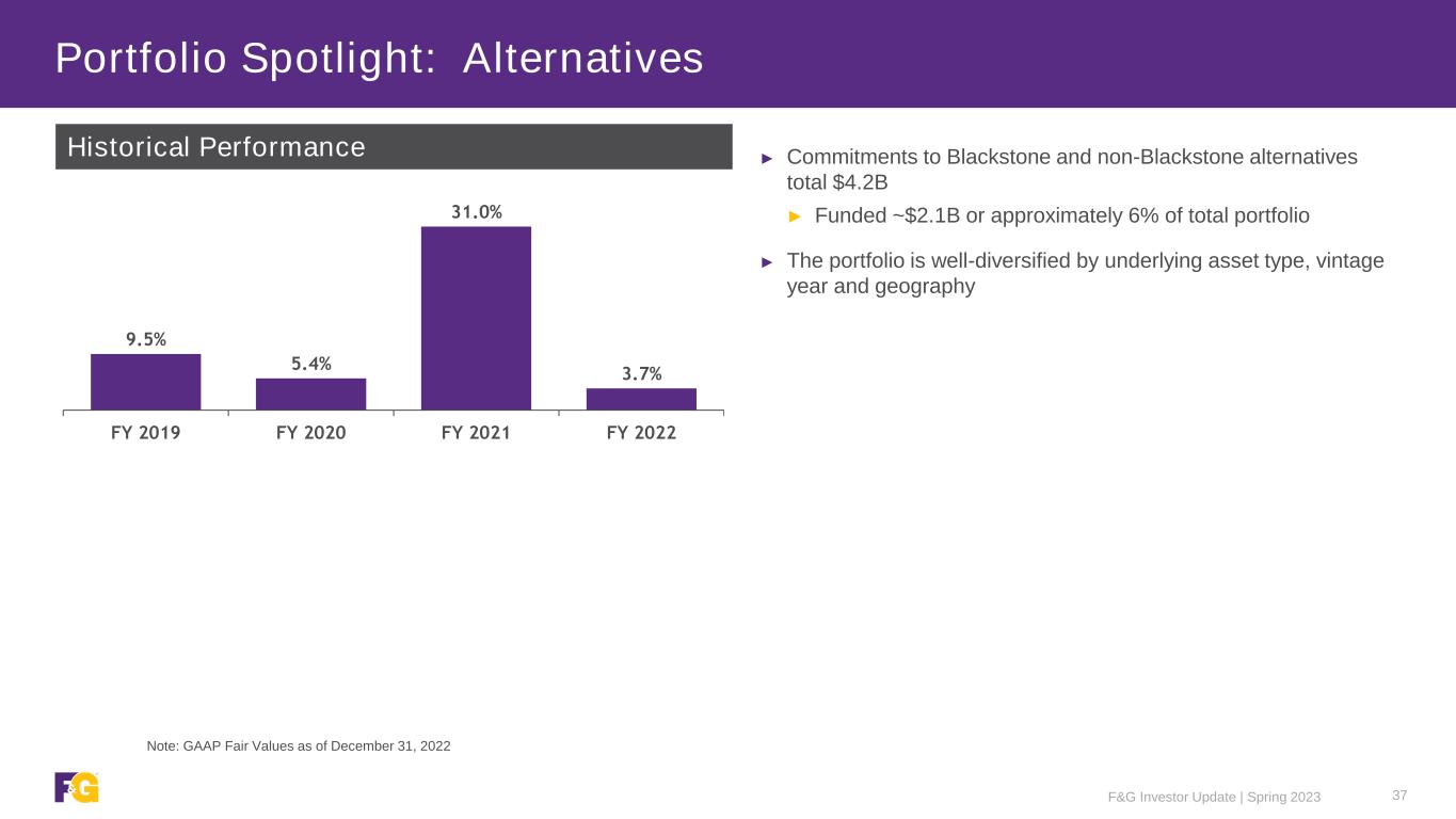 F&G Investor Update | Spring 2023 37 Portfolio Spotlight: Alternatives ► Commitments to Blackstone and non-Blackstone alternatives total $4.2B ► Funded ~$2.1B or approximately 6% of total portfolio ► The portfolio is well-diversified by underlying asset type, vintage year and geography Historical Performance Note: GAAP Fair Values as of December 31, 2022 9.5% 5.4% 31.0% 3.7% FY 2019 FY 2020 FY 2021 FY 2022
