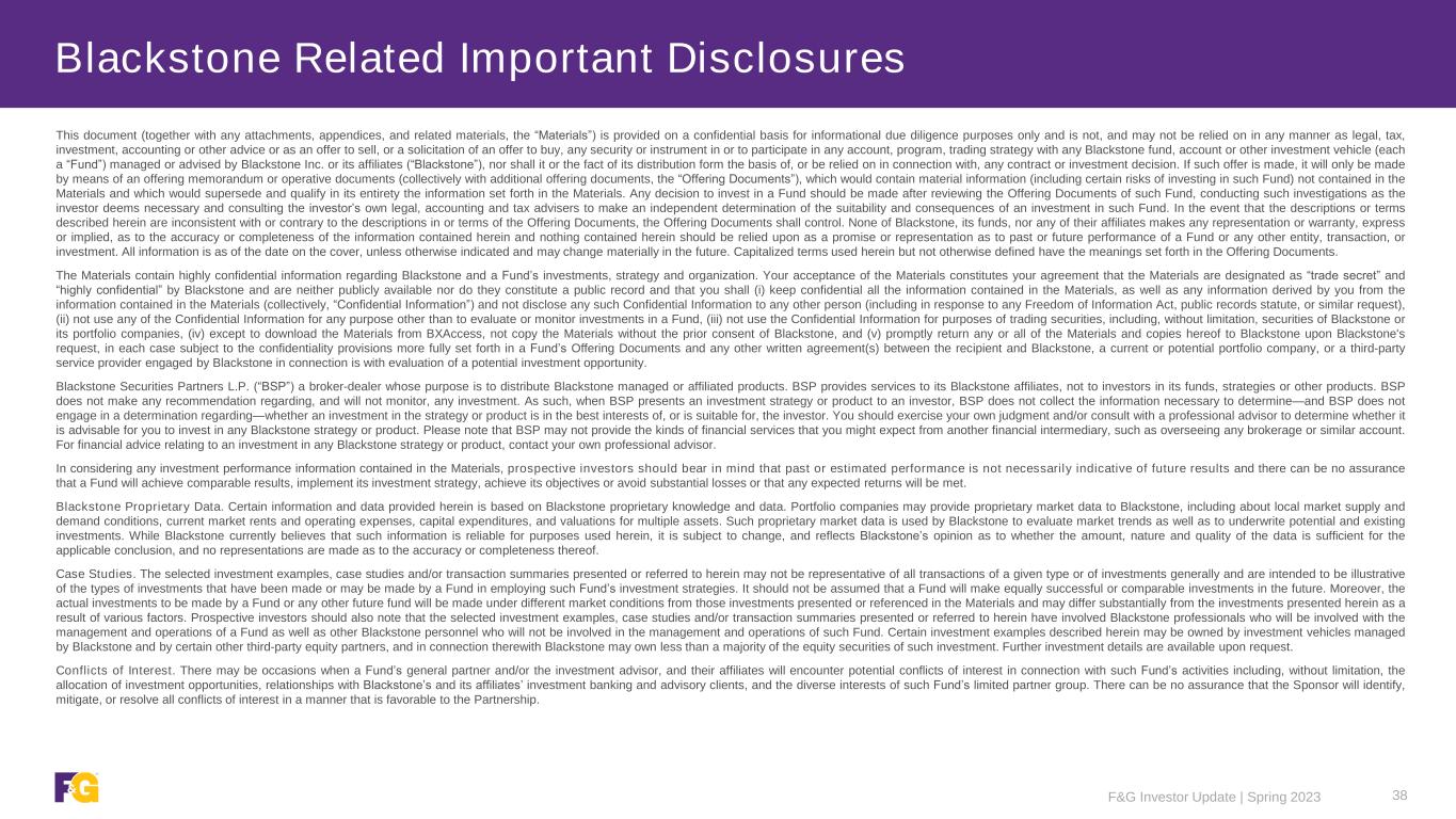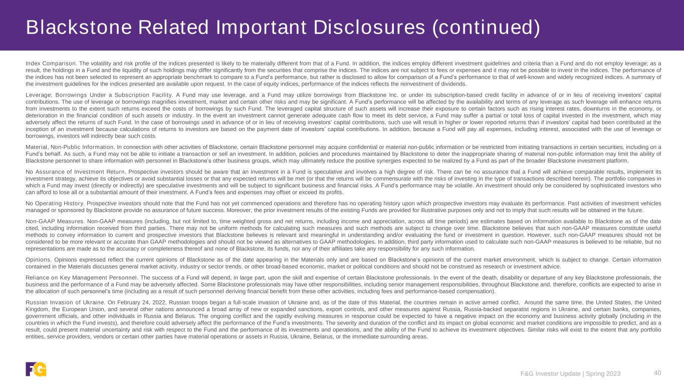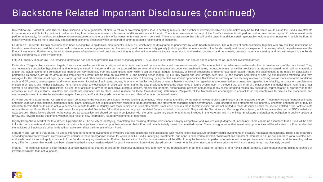 F&G Investor Update | Spring 2023 39 Blackstone Related Important Disclosures (continued) Diversification; Potential Lack Thereof. Diversification is not a guarantee of either a return or protection against loss in declining markets. The number of investments which a Fund makes may be limited, which would cause the Fund’s investments to be more susceptible to fluctuations in value resulting from adverse economic or business conditions with respect thereto. There is no assurance that any of the Fund’s investments will perform well or even return capital; if certain investments perform unfavorably, for the Fund to achieve above-average returns, one or a few of its investments must perform very well. There is no assurance that this will be the case. In addition, certain geographic regions and/or industries in which the Fund is heavily invested may be more adversely affected from economic pressures when compared to other geographic regions and/or industries. Epidemic / Pandemic. Certain countries have been susceptible to epidemics, most recently COVID-19, which may be designated as pandemics by world health authorities. The outbreak of such epidemics, together with any resulting restrictions on travel or quarantines imposed, has had and will continue to have a negative impact on the economy and business activity globally (including in the countries in which the Funds invest), and thereby is expected to adversely affect the performance of the Funds’ Investments. Furthermore, the rapid development of epidemics could preclude prediction as to their ultimate adverse impact on economic and market conditions, and, as a result, presents material uncertainty and risk with respect to the Funds and the performance of their Investments. ERISA Fiduciary Disclosure. The foregoing information has not been provided in a fiduciary capacity under ERISA, and it is not intended to be, and should not be considered as, impartial investment advice. Estimates / Targets. Any estimates, targets, forecasts, or similar predictions or returns set forth herein are based on assumptions and assessments made by Blackstone that it considers reasonable under the circumstances as of the date hereof. They are necessarily speculative, hypothetical, and inherently uncertain in nature, and it can be expected that some or all of the assumptions underlying such estimates, targets, forecasts, or similar predictions or returns contained herein will not materialize and/or that actual events and consequences thereof will vary materially from the assumptions upon which such estimates, targets, forecasts, or similar predictions or returns have been based. Among the assumptions to be made by Blackstone in performing its analysis are (i) the amount and frequency of current income from an investment, (ii) the holding period length, (iii) EBITDA growth and cost savings over time, (iv) the manner and timing of sale, (v) exit multiples reflecting long-term averages for the relevant asset type, (vi) customer growth and other business initiatives, (vii) availability of financing, (viii) potential investment opportunities Blackstone is currently or has recently reviewed and (ix) overall macroeconomic conditions such as GDP growth, unemployment and interest rate levels. Inclusion of estimates, targets, forecasts, or similar predictions or returns herein should not be regarded as a representation or guarantee regarding the reliability, accuracy or completeness of such information, and neither Blackstone nor a Fund is under any obligation to revise such returns after the date provided to reflect the occurrence of future events, even in the event that any or all of the assumptions underlying such returns are later shown to be incorrect. None of Blackstone, a Fund, their affiliates or any of the respective directors, officers, employees, partners, shareholders, advisers and agents of any of the foregoing makes any assurance, representation or warranty as to the accuracy of such assumptions. Investors and clients are cautioned not to place undue reliance on these forward-looking statements. Recipients of the Materials are encouraged to contact Fund representatives to discuss the procedures and methodologies used to make the estimates, targets, forecasts, and/or similar predictions or returns and other information contained herein. Forward-Looking Statements. Certain information contained in the Materials constitutes “forward-looking statements,” which can be identified by the use of forward-looking terminology or the negatives thereof. These may include financial estimates and their underlying assumptions, statements about plans, objectives and expectations with respect to future operations, and statements regarding future performance. Such forward‐looking statements are inherently uncertain and there are or may be important factors that could cause actual outcomes or results to differ materially from those indicated in such statements. Blackstone believes these factors include but are not limited to those described under the section entitled “Risk Factors” in its Annual Report on Form 10‐K for the most recent fiscal year ended December 31 of that year and any such updated factors included in its periodic filings with the Securities and Exchange Commission, which are accessible on the SEC’s website at www.sec.gov. These factors should not be construed as exhaustive and should be read in conjunction with the other cautionary statements that are included in the Materials and in the filings. Blackstone undertakes no obligation to publicly update or review any forward‐looking statement, whether as a result of new information, future developments or otherwise. Highly Competitive Market for Investment Opportunities. The activity of identifying, completing and realizing attractive investments is highly competitive, and involves a high degree of uncertainty. There can be no assurance that a Fund will be able to locate, consummate and exit