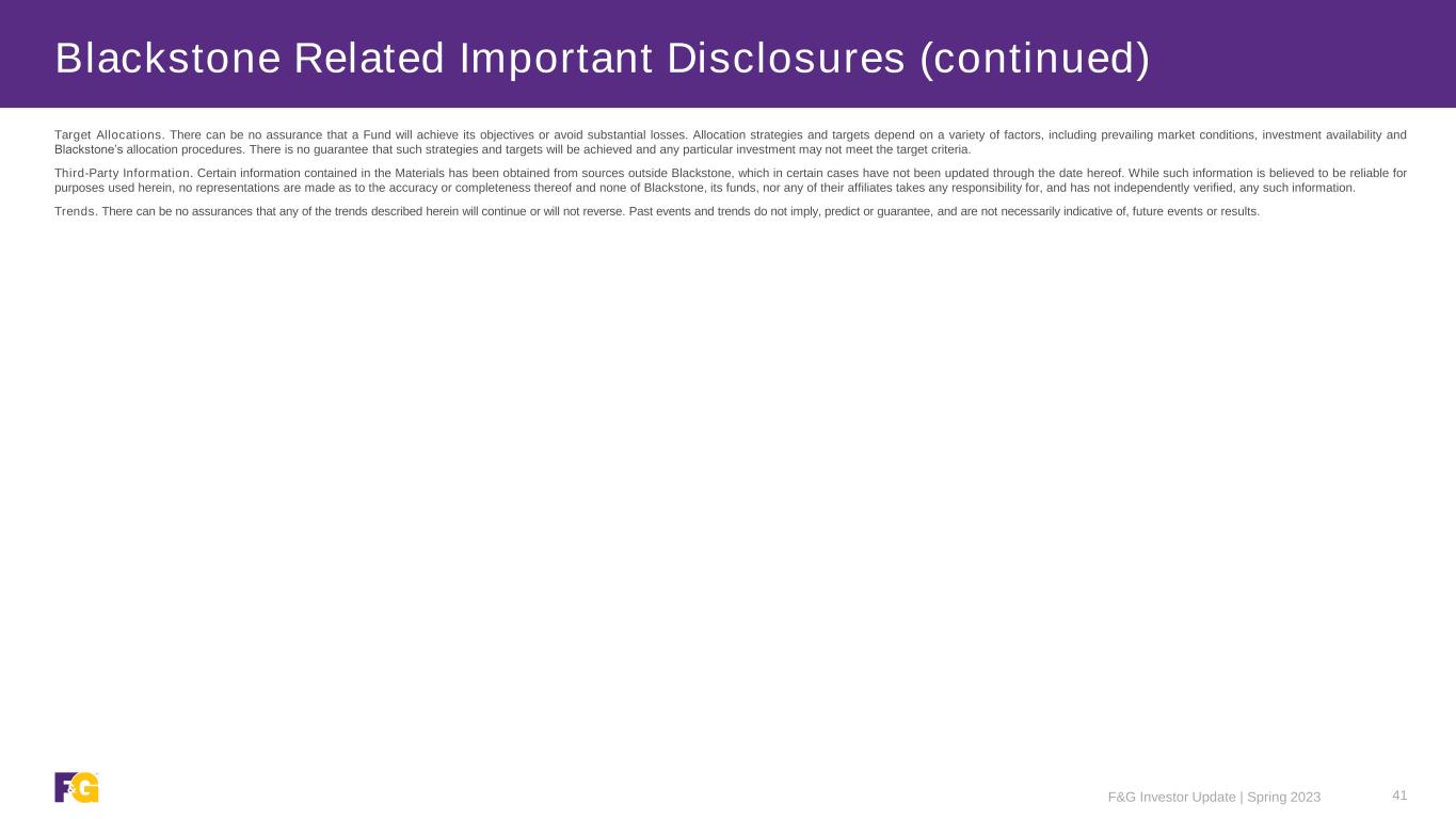 F&G Investor Update | Spring 2023 41 Blackstone Related Important Disclosures (continued) Target Allocations. There can be no assurance that a Fund will achieve its objectives or avoid substantial losses. Allocation strategies and targets depend on a variety of factors, including prevailing market conditions, investment availability and Blackstone’s allocation procedures. There is no guarantee that such strategies and targets will be achieved and any particular investment may not meet the target criteria. Third-Party Information. Certain information contained in the Materials has been obtained from sources outside Blackstone, which in certain cases have not been updated through the date hereof. While such information is believed to be reliable for purposes used herein, no representations are made as to the accuracy or completeness thereof and none of Blackstone, its funds, nor any of their affiliates takes any responsibility for, and has not independently verified, any such information. Trends. There can be no assurances that any of the trends described herein will continue or will not reverse. Past events and trends do not imply, predict or guarantee, and are not necessarily indicative of, future events or results.