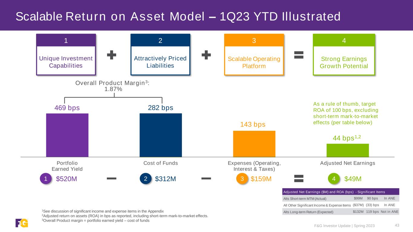 F&G Investor Update | Spring 2023 43 Scalable Return on Asset Model – 1Q23 YTD Illustrated 1See discussion of significant income and expense items in the Appendix 2Adjusted return on assets (ROA) in bps as reported, including short-term mark-to-market effects. 3Overall Product margin = portfolio earned yield – cost of funds 469 bps 282 bps 143 bps 44 bps1,2 Portfolio Earned Yield Cost of Funds Expenses (Operating, Interest & Taxes) Adjusted Net Earnings Unique Investment Capabilities Attractively Priced Liabilities Scalable Operating Platform Strong Earnings Growth Potential Overall Product Margin3: 1.87% 1 2 3 4$520M $312M $159M $49M 1 2 3 4 As a rule of thumb, target ROA of 100 bps, excluding short-term mark-to-market effects (per table below) Adjusted Net Earnings ($M) and ROA (bps) - Significant Items Alts Short-term MTM (Actual) $99M 90 bps In ANE All Other Significant Income & Expense Items ($37M) (33) bps In ANE Alts Long-term Return (Expected) $132M 119 bps Not in ANE